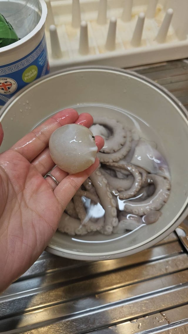 Hello! I defrosted a frozen octopus that I bought earlier. When I cut open the head, I found a white, ball-shaped object inside, as well as an orange-colored part that looks similar to fish roe. I’d like to ask what these two things are and whether they are edible. If they are edible, do they need to be cut open or soaked and cleaned in a specific way? Thank you!