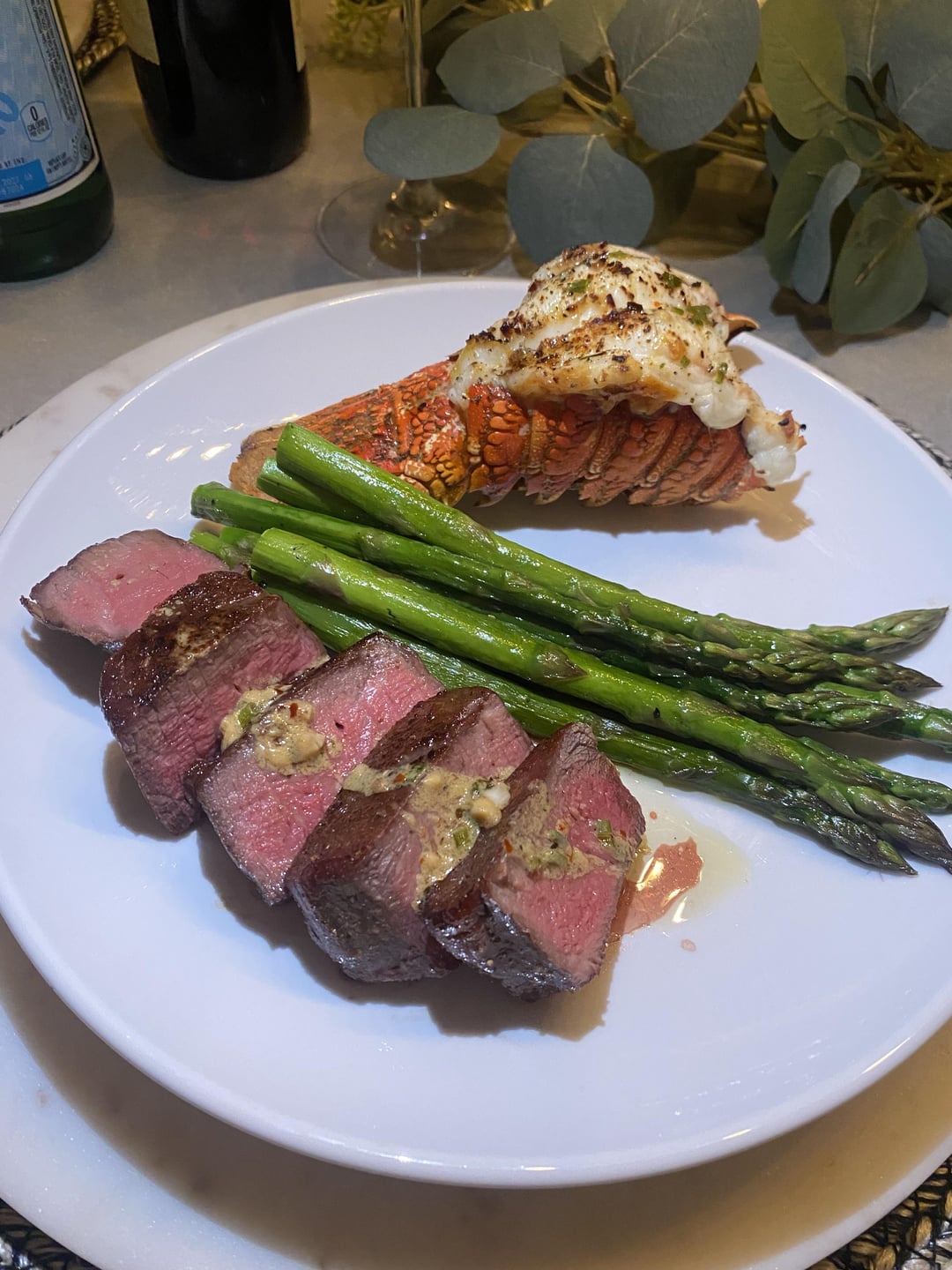 I prefer ribeye with chimichurri over filet any day. That being said, the lobster tail looks good, and I’d take properly cooked asparagus over whole carrots. Potatoes do nothing for me.