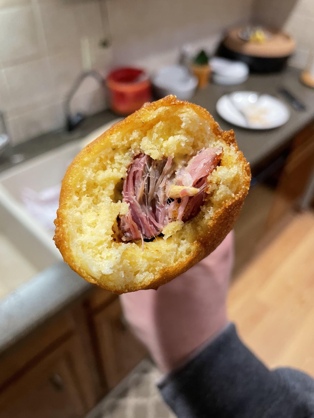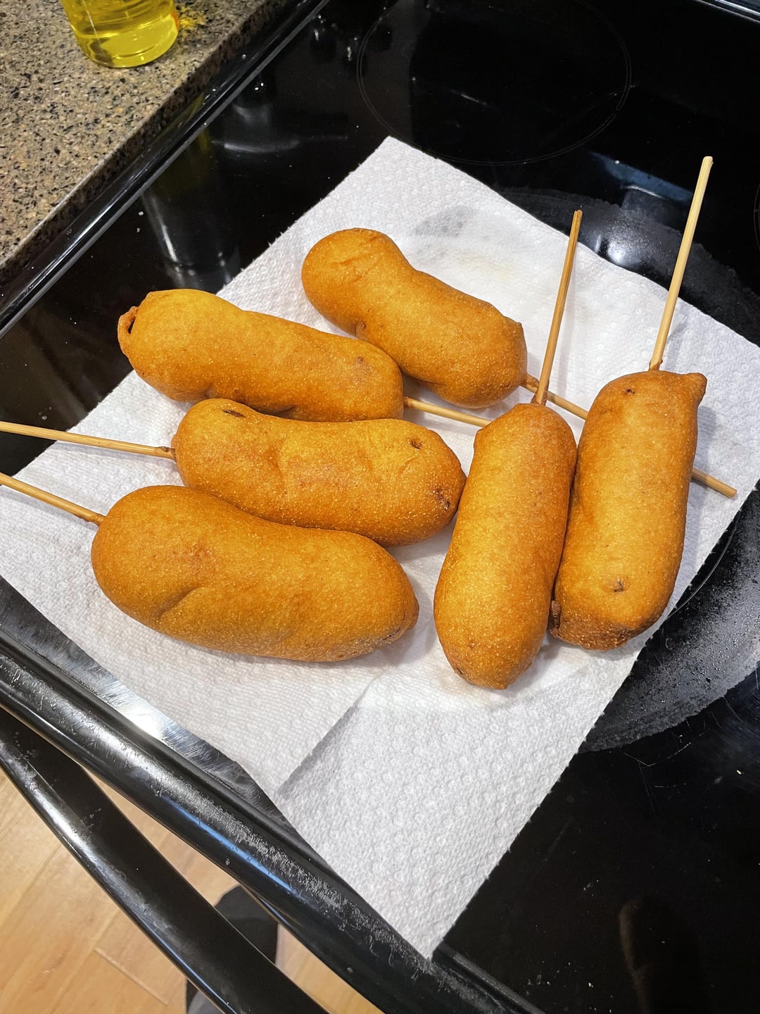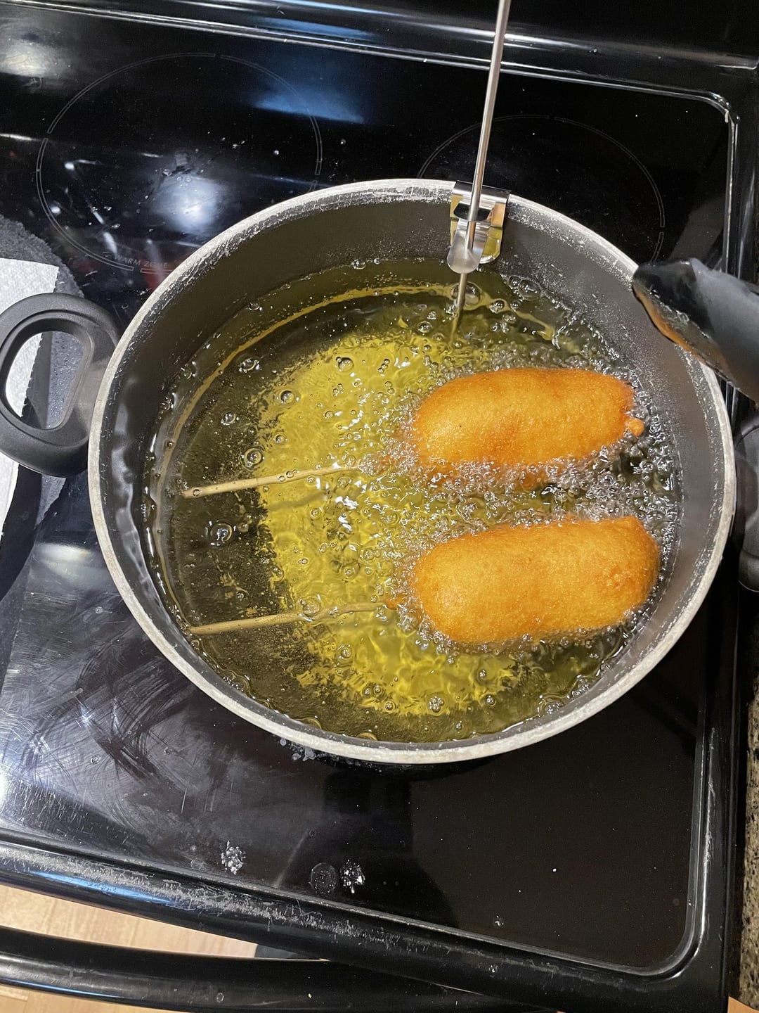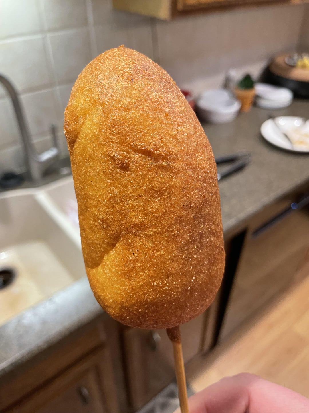 I did not add any sauce to the ribs, just a dry rub (meat church-Honey Hog) and the “corn dog” was a bit dry. I did dip the corn dog into bbq sauce, and that helped a bit, but I think the batter left a little to be desired too, so I might try to find a different recipe next time. I used an allrecipes recipe for the batter.