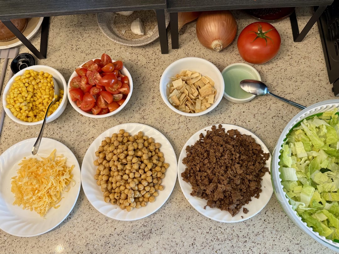 Quiet-Painting3 8 months ago Ingredients are what you see there!* Air fried tortilla strips w/ salt * Ground beef w/ taco seasoning * Chickpeas roasted a bit with oil and cajun seasoning * Corn, cherry tomatoes, cheddar cheese, lime juice, romaineNot pictured: Boathouse farms cilantro avocado sauce + quick pickled red onions + a dollop of greek yogurt