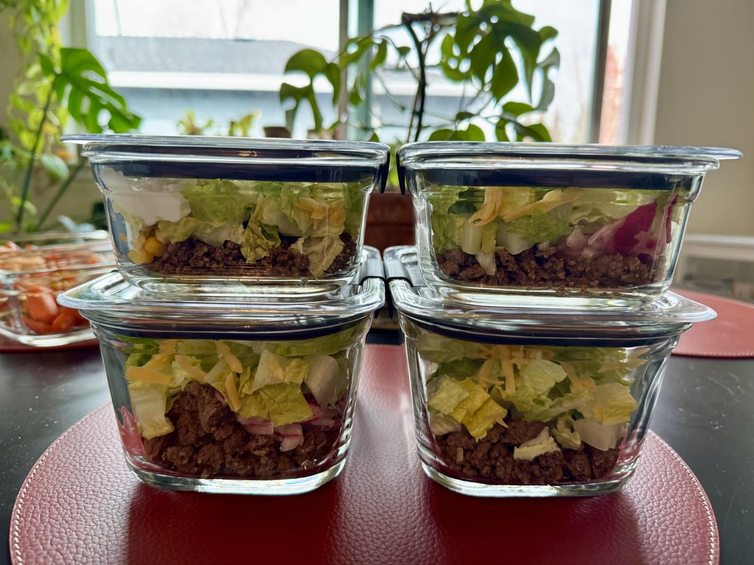 Taco Salad Assembly by Quiet-Painting3 3 Comments Quiet-Painting3 8 months ago Ingredients are what you see there!* Air fried tortilla strips w/ salt * Ground beef w/ taco seasoning * Chickpeas roasted a bit with oil and cajun seasoning * Corn, cherry tomatoes, cheddar cheese, lime juice, romaineNot pictured: Boathouse farms cilantro avocado sauce + quick pickled red onions + a dollop of greek yogurt bpeemp 8 months ago Does the romaine hold up by day 4 or is it on the mushier wet side? Dense-Biscotti-6101 8 months ago Do you like to eat it cold or heat it up?Write A CommentYou must be logged in to post a comment.