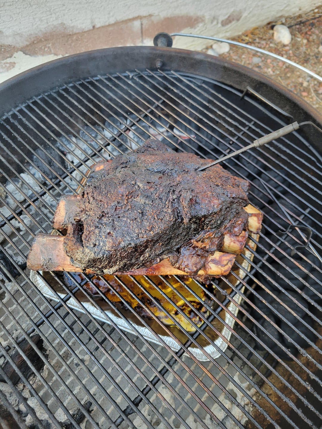 I have been craving beef ribs for the last few weeks. Made a trip to the butcher and picked this prime rack up. Went 8 hours unwrapped on the 26" while cooking chicken for the week of lunches and leftovers on the 22". Snaked it, with hickory chunks. I think I finally dialed my method in with the snake on my 26". Maintained 245-255 for the cook. Im pretty happy with this one. Just a simple salt brine overnight, and SPG with worstishire for a binder.