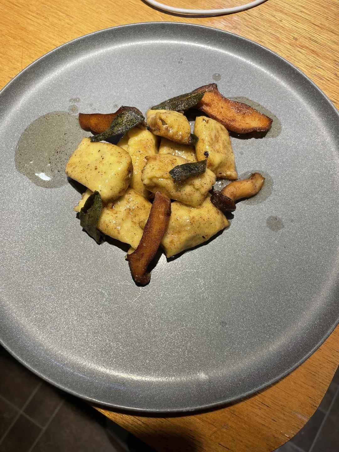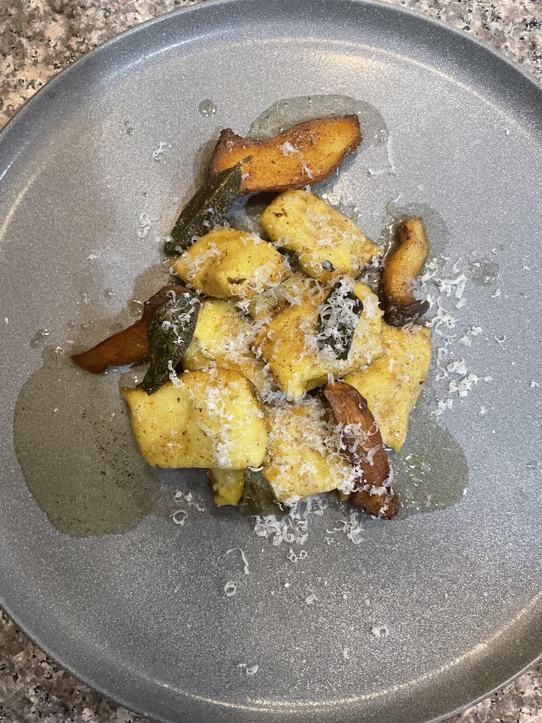 Starting my pasta journey and decided to take photos and share . This is my first time making agnolotti ? The dish – mushroom and ricotta stuffed agnolotti with brown butter sage sauce , and garnished with trumpet mushrooms that were seared and basted in the brown butter .