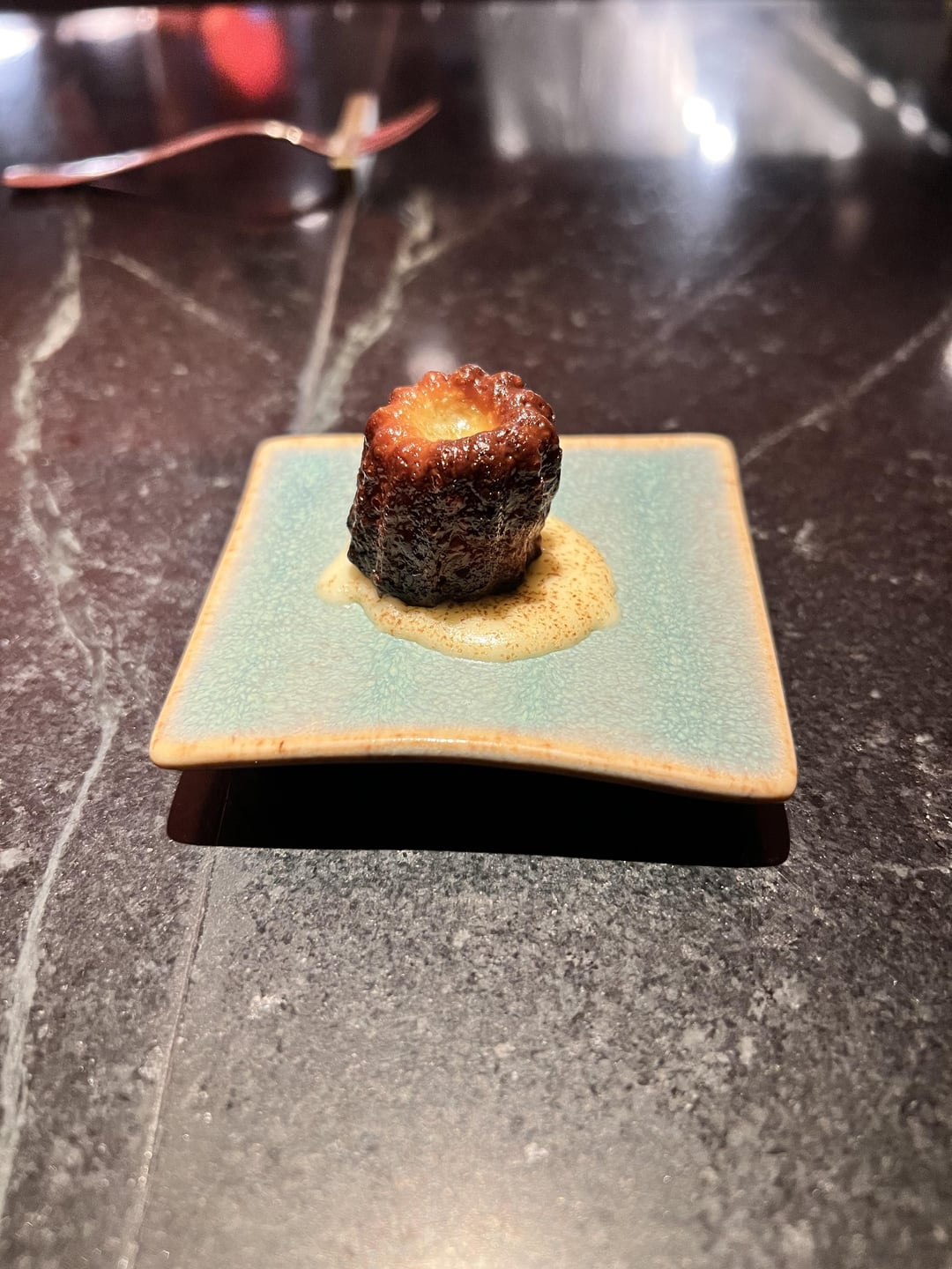 Duck Fat Canele. Cheese course. Another favorite of the night. Canele was perfectly baked. Reminded of the mini Canele from Joel Robuchon cafe, Tokyo. Served with a torched cheese sauce.