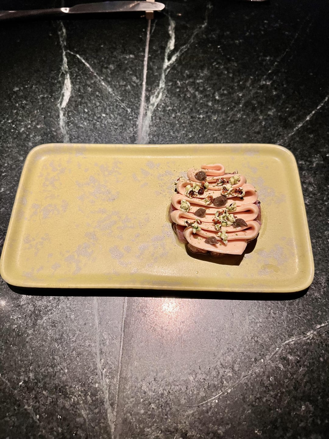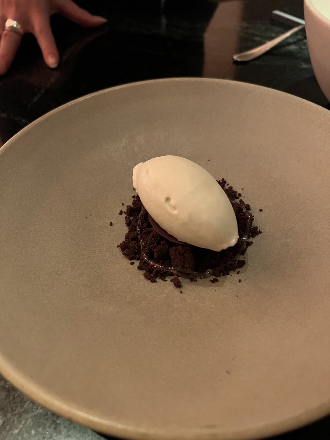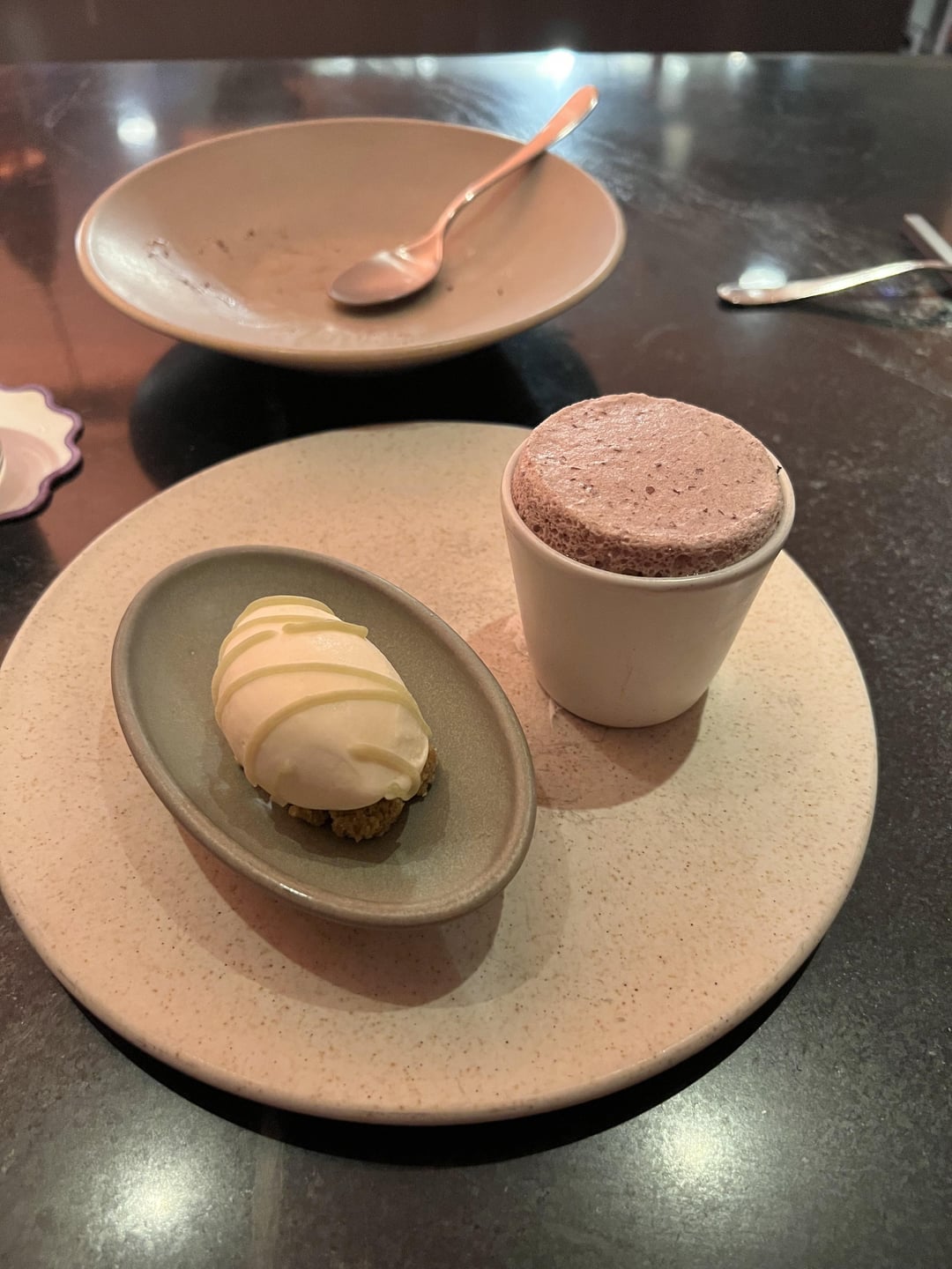 Sweet adzuki soufflé. Wasn’t a big fan of this. The “soufflé” seemed more like a adzuki foam that was baked enough just to set the top. Everything underneath was liquidy foam. Ice cream was again very hard. No richness at all, sour and bitter.
