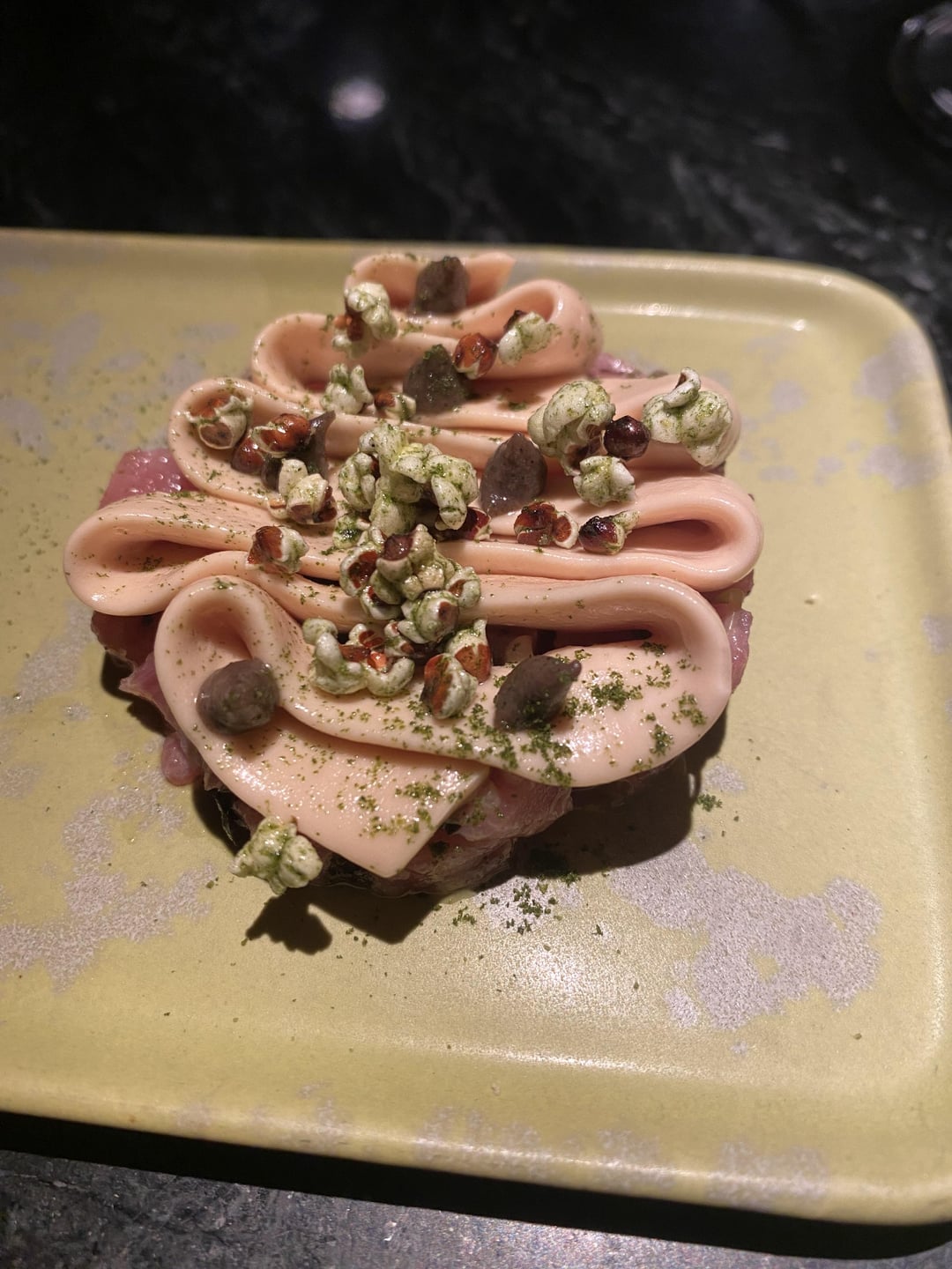 Foie gras ganache. Ganache was way too salty and had too much cream that masked the tunas flavor. The tuna with the vinaigrette was very good