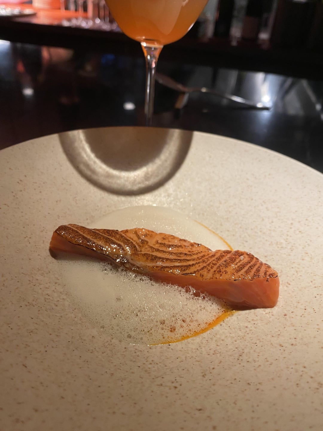 Smoked trout, heavy on the smoke. Most Korean influence on this dish with the spicy sauce