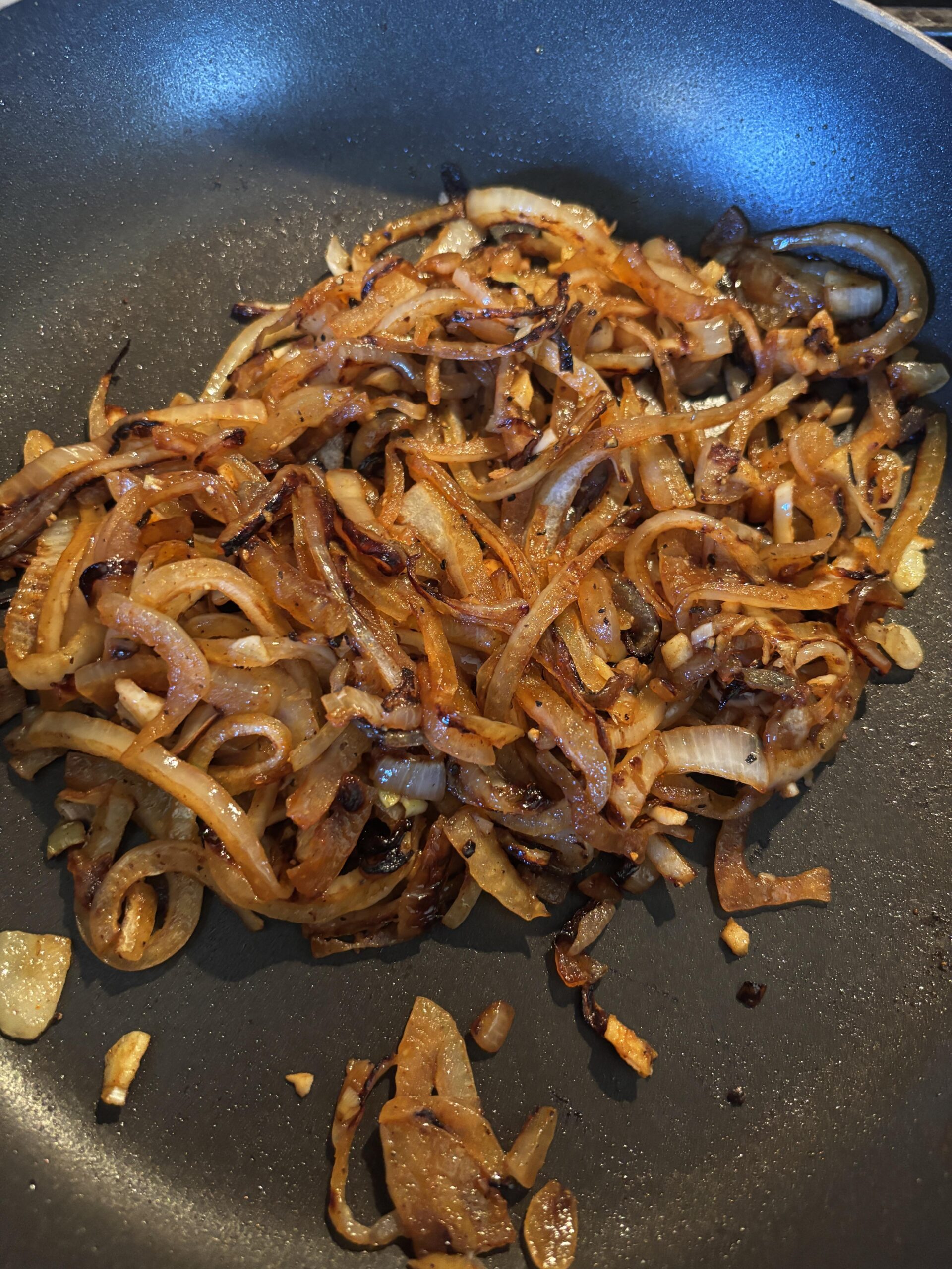“Carmelized” (had to rush them today) onions with paprika, cayenne pepper, and garlic. Put on a chicken sandwich with some white cheddar and hot honey 🤤