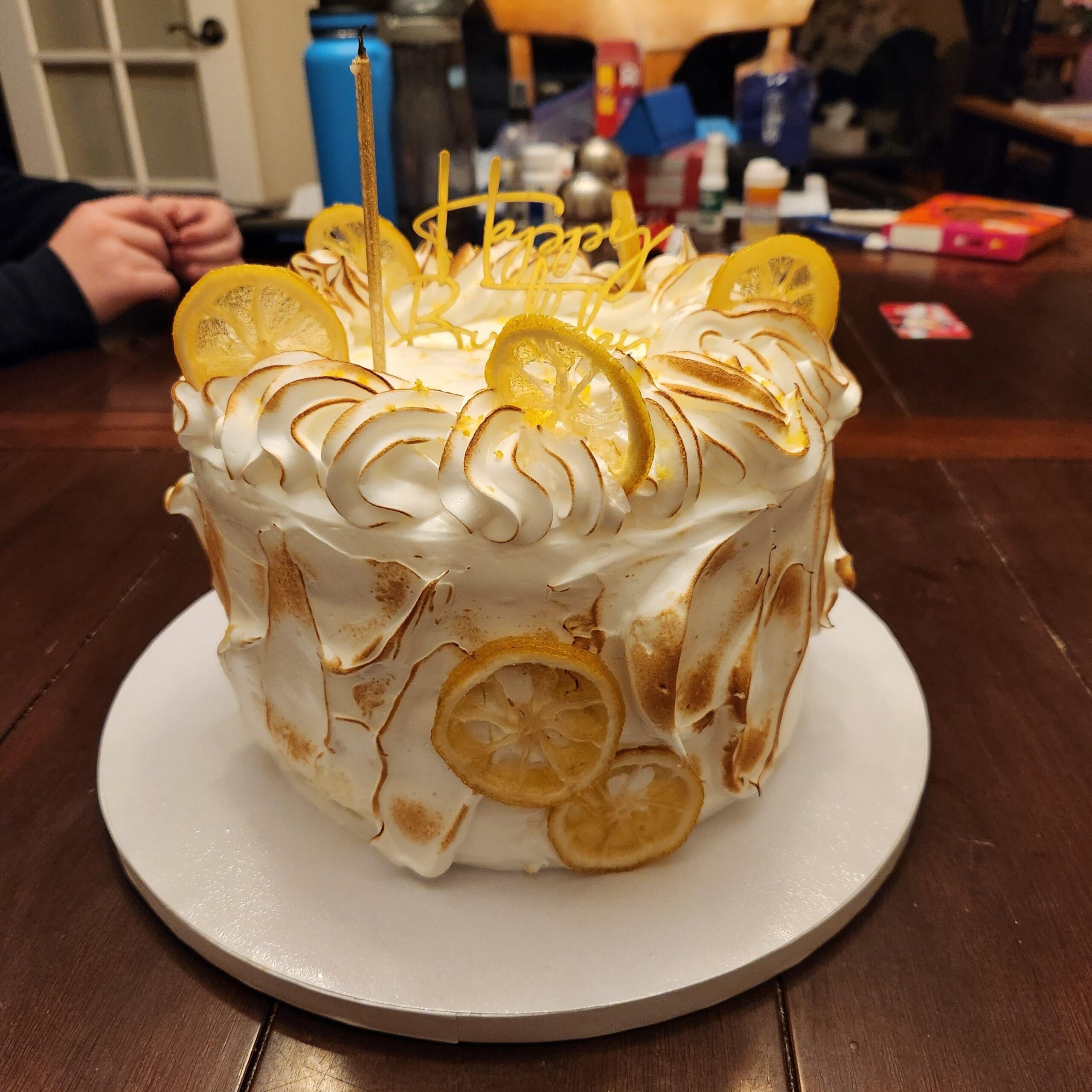She didn't make it, and local person did. About 7 layers of lemon sponge cake with a toasted meringue outer "icing" and layers of vanilla whipped cream, and lemon curd, between cake layers.by WarhammerRyan 3 Comments WarhammerRyan 1 year ago And candied lemon accents…. Lost_Figure_5892 1 year ago Whew that is gorgeous! KathleenJohn 1 year ago Stunning!Write A CommentYou must be logged in to post a comment.