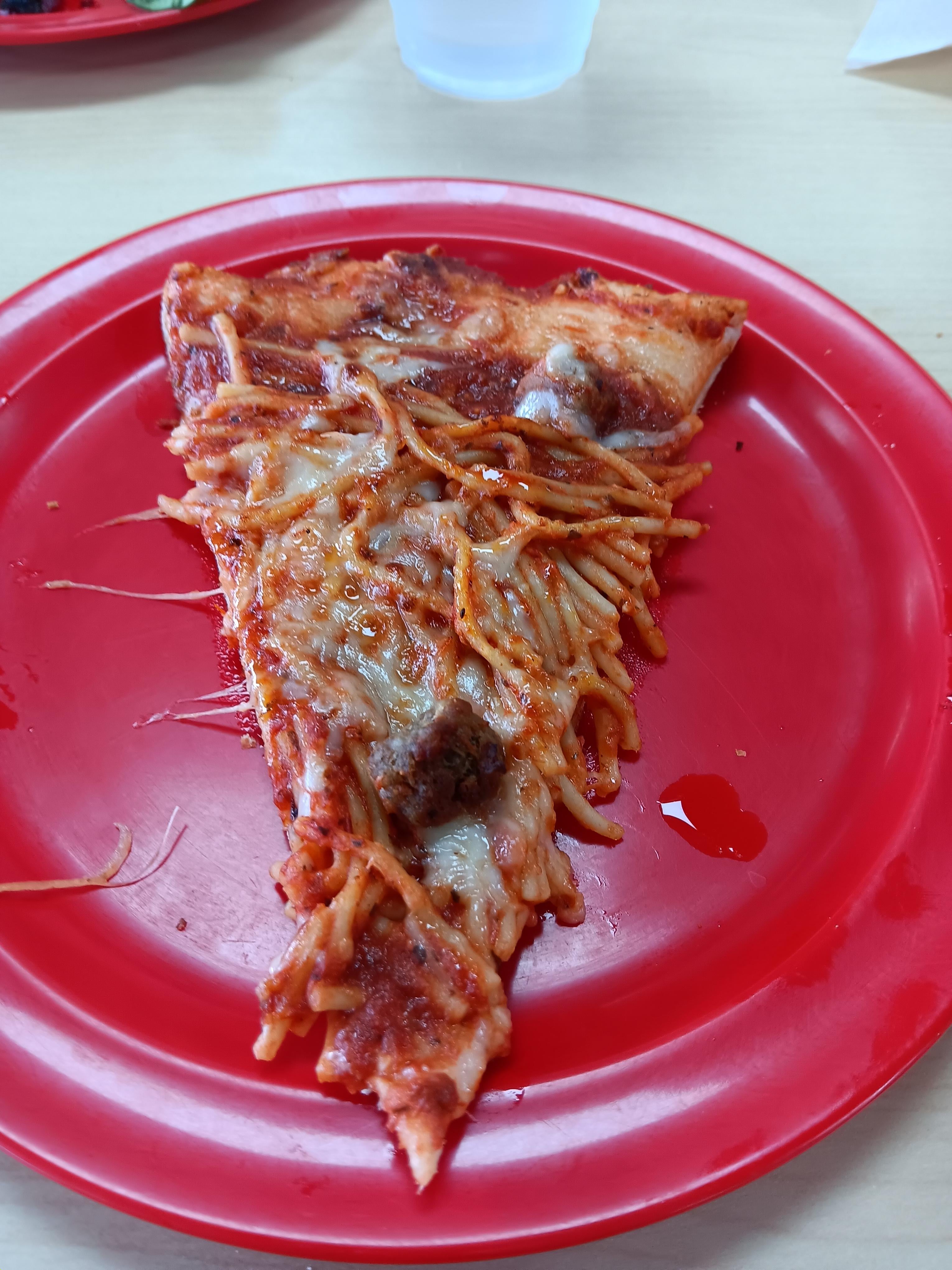 I was sent here from r/pizza. I ran into this in a local pizza place. It's a regular crust and cheese, topped with what tastes like canned spaghetti and pieces of Italian sausage on it.