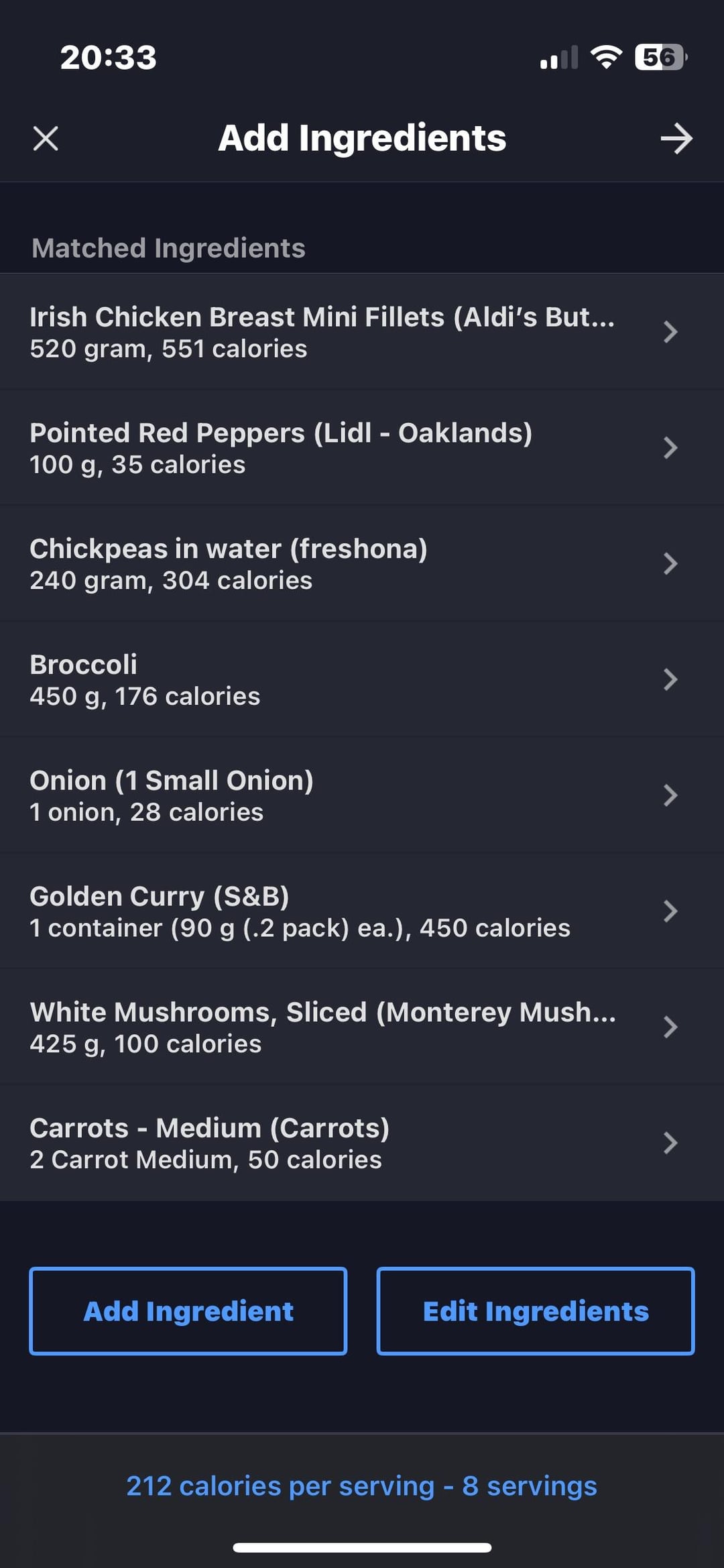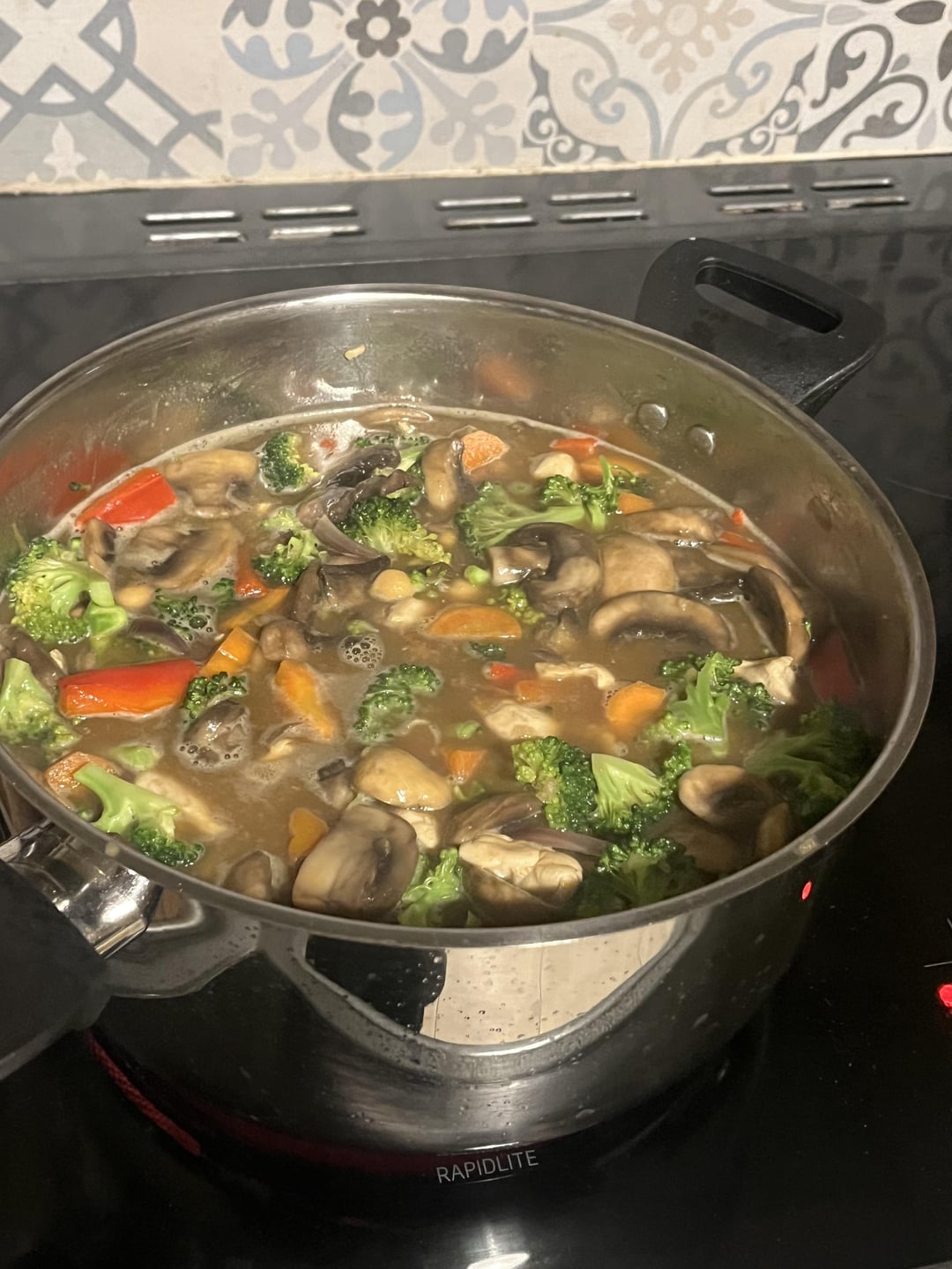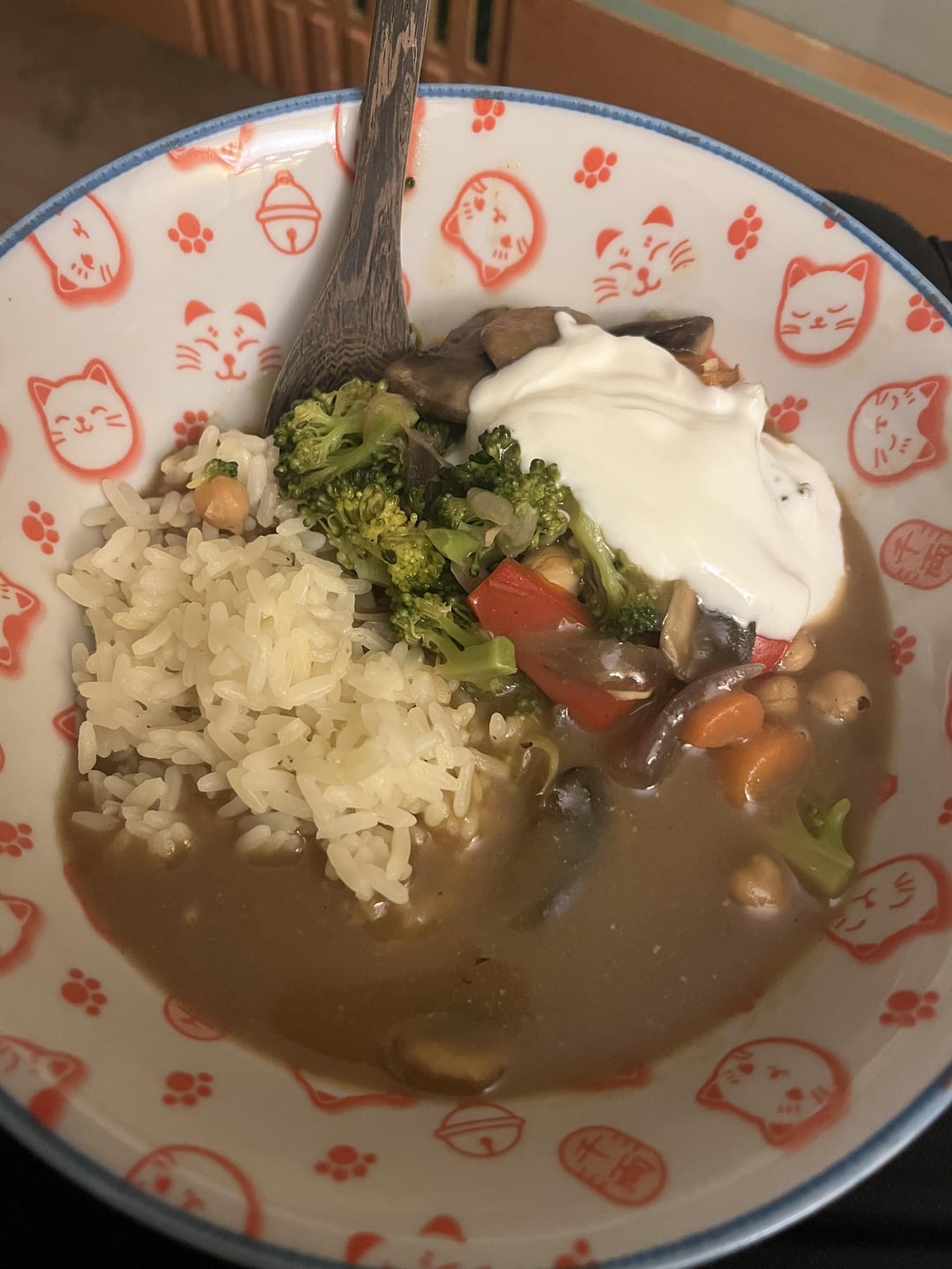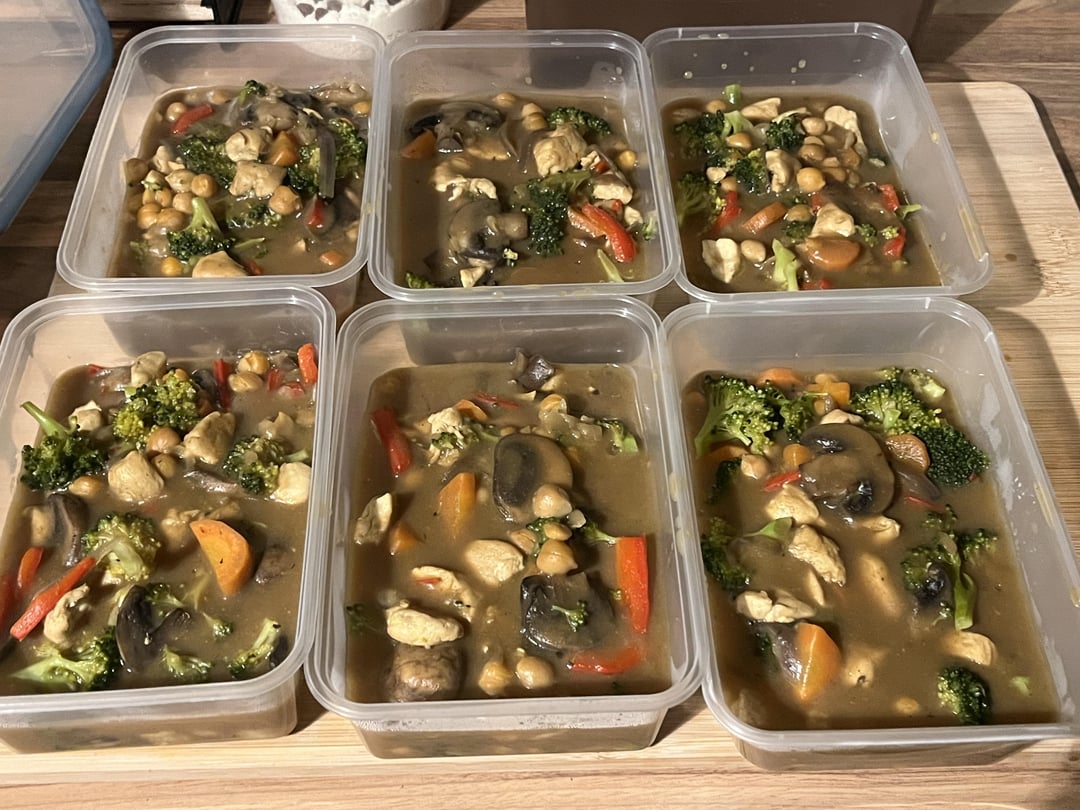 Fry off onion until softened. I didn’t use oil for calorie reasons but you do you. Once softened add garlic if you have it, then peppers and mushrooms, with a sprinkle of salt to sweat. Add carrots and chickpeas, enough water to cover, and the Japanese curry. Bring to a boil, then reduce to a simmer. I quickly fried off my diced chicken in another pan and added it to finish poaching in the sauce. Add broccoli once sauce begins to thicken for the last few minutes so it doesn’t overcook. Taste for seasoning as it’s a huge pot of food. I added extra pepper, aromat, and turmeric. Serve over rice.