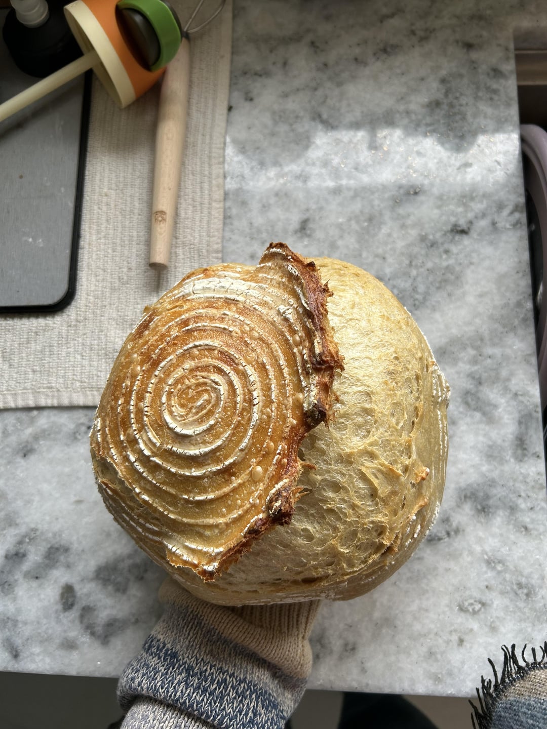 I used this video’s method of stretch and folds/bench folds/coil folds over a total BF time of 9ish hours (kitchen is between 63-65°F), and a cold retard of about 17 hours. Baked in preheated dutch oven with ice cubes and lid on at 475° for 30 min, then removed the lid and baked 20 more at 425°