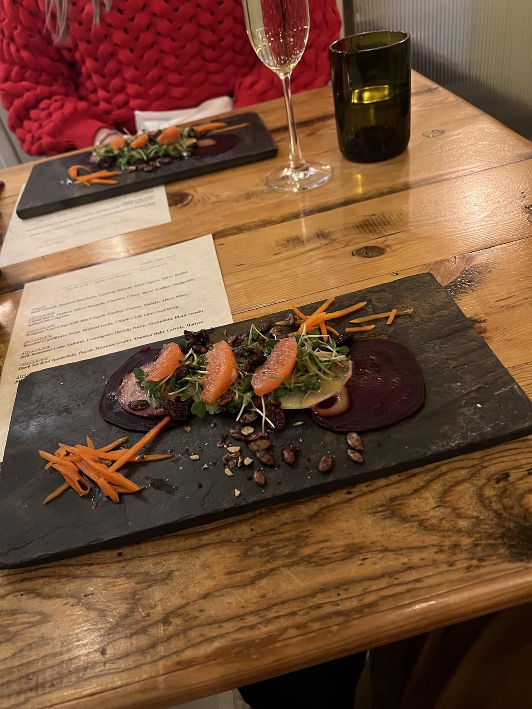 Cured Beets, Daikon, Micro Arugula, Cherries, Citrus, Burnt Scallion Vinaigrette, Salted Olive Pepitas
