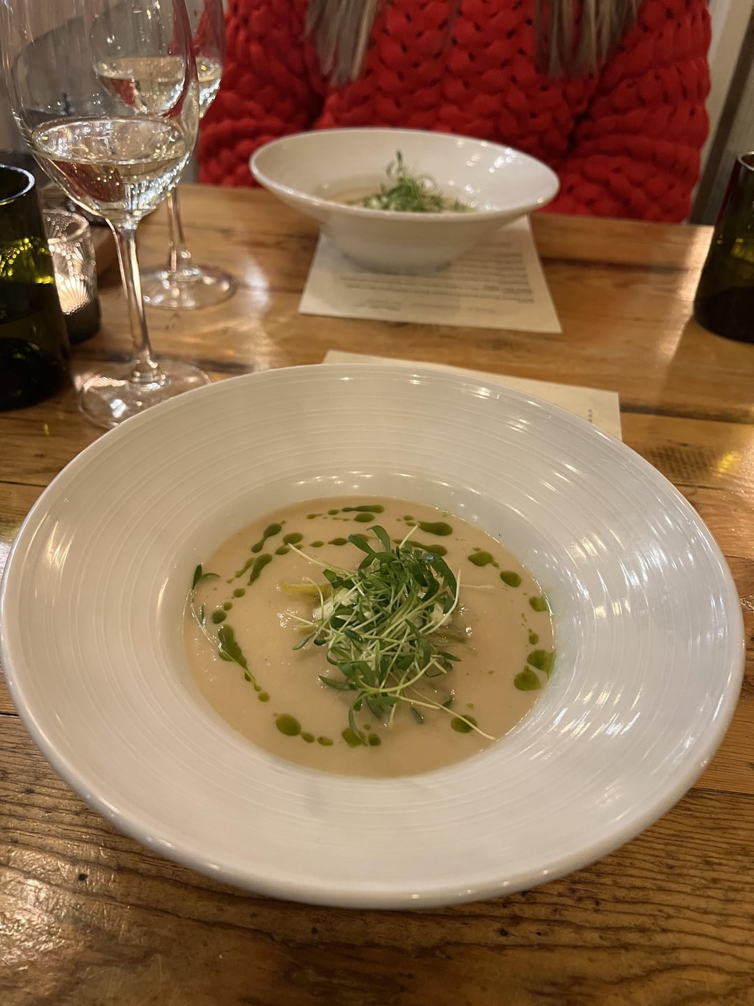 Roasted Cauliflower Soup, Braised Leeks, Cilantro Oil, Lime Leaf-Whip