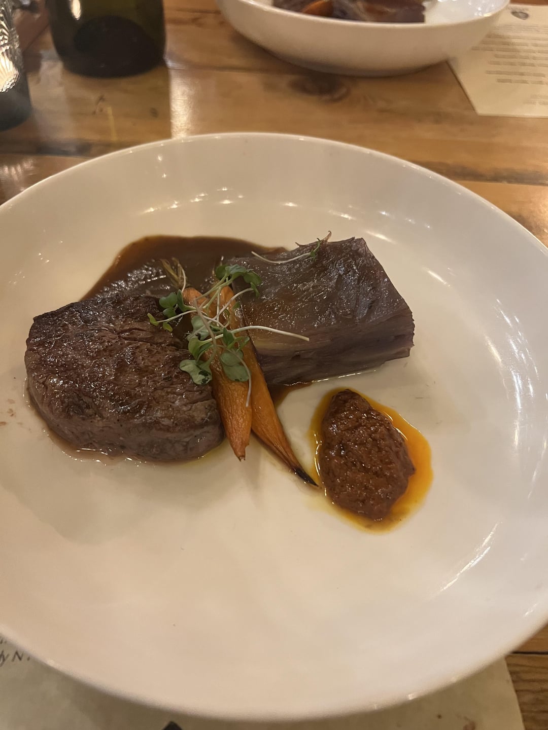 Duck Fat Beef Tenderloin, Purple Potatoes Gratin, Smoked Baby Carrots, Harissa