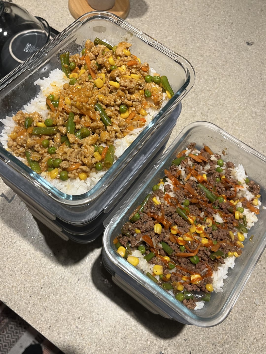 My beginner prep. Teriyaki beef and red Thai curry chicken. Good jasmine rice.
