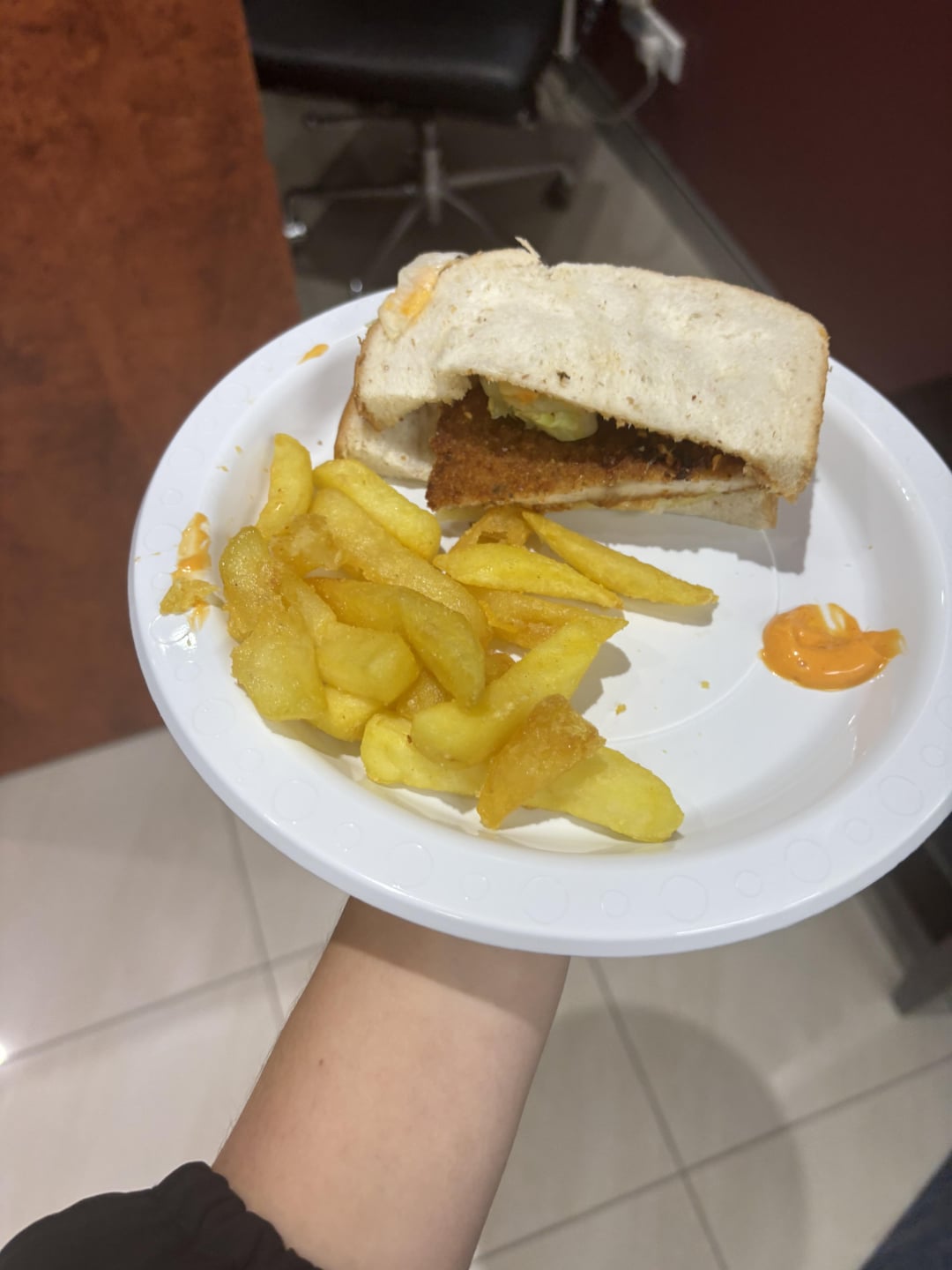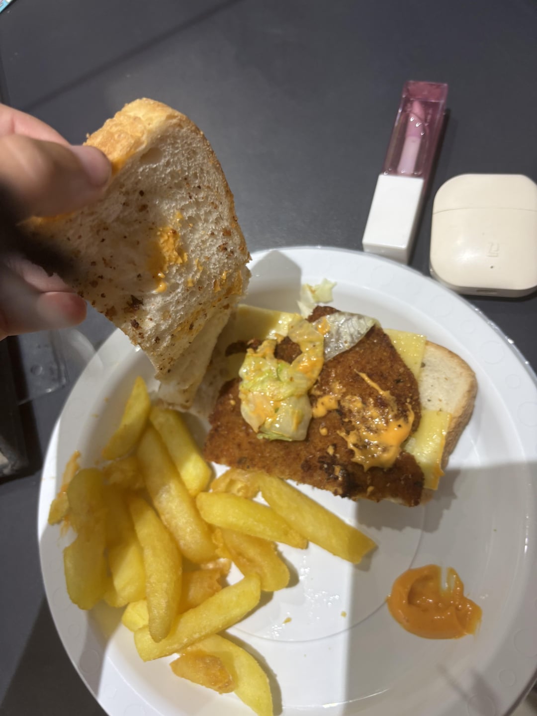 Spicy mayo, lettuce, cheese & chicken.I’m not sure if the bread is whole meal or white. by chloemarci 1 Comment DiscombobulatedBus81 12 months ago heya chloe! 🙂here is a nice lil breakdown for ya…bread (white enriched; 1 slice or ≈30g) ≈75chicken schnitzel (breaded & fried; ≈2.5oz or ≈70g cooked) ≈160mayo (spicy; ≈1 tbsp or ≈15g) ≈40cheese (average; 2 halves or ≈1 whole) ≈75lettuce (fresh; shredded) >5french fries/chips (seasoned; average; ≈70g) ≈200running estimate: ≈***550 calories!*** ✌️Write A CommentYou must be logged in to post a comment.
