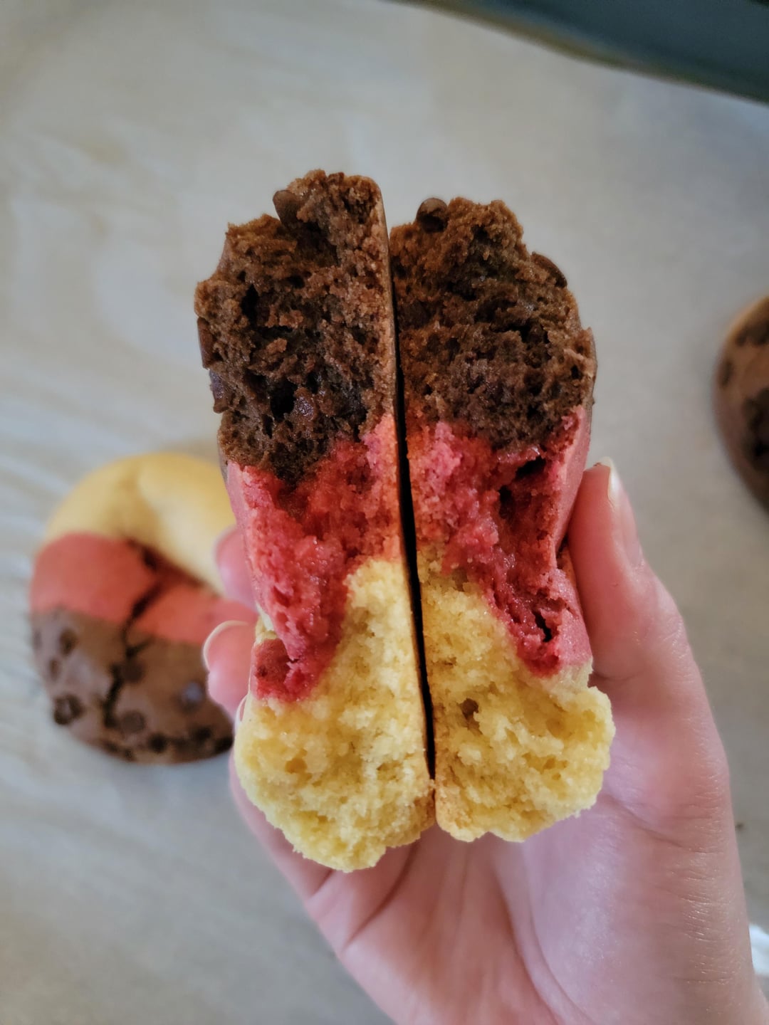 Alternatively, put choco in the middle since it’s a little overcooked and put pink on side since it’s a little wet still.