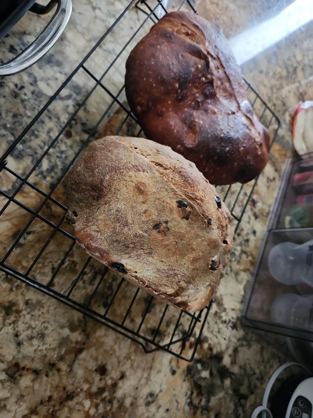 Followed a recipe for cinamon raisin sourdough. During the second stretch and fold I decided I didn't want a giant loaf of it, so I split the dough and continued the process. 12 hours in the fridge.
