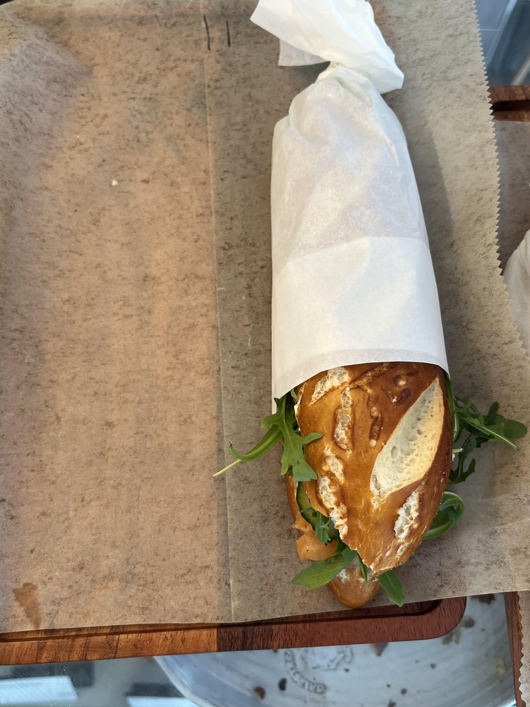 JetFuel0909 12 months ago Looks like more or less 100g of smoked salmon Pic: https://100-grams.blogspot.com/2013/09/100-grams-of-smoked-salmon.html?m=1Found these pretzel buns that look similar: https://www.heb.com/product-detail/central-market-pretzel-hoagie-buns/1412649 and google says an average they have ~250Salmon: 120 Bun: 300 Greens: 10-20Total: 420 round up to 450-500 to be safe