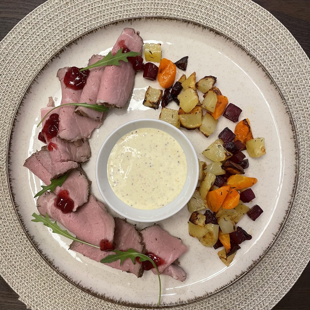 20h sous vide, 54c eye round. I just seared in hot pan, put some dijon mustard on it then a mix of thyme, rosemary and dried garlic. Then vacuum sealed, 54C in sousvide for 20h. Cut thin, top with some cranberry jam, maldon salt, rucola. Sauce is dijonaise, and side is potatoes, carrots cut to diamond shape and beets, touch of oil, salt and thyme.
