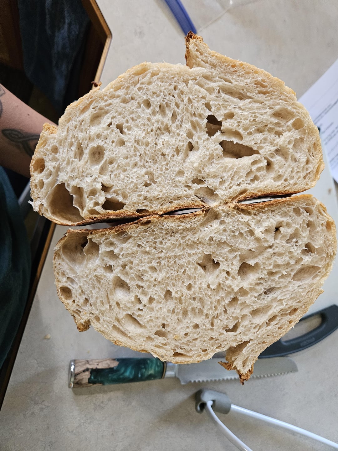 AutoModerator 12 months ago **Hello kay-b808,****FRIENDLY [RULE 5](https://www.reddit.com/r/Sourdough/wiki/sourdoughrules/) BOT HERE – GENERAL REMINDER**.**Sourdough Bake photos** are removed if **Rule 5** isn’t met (**include ingredients & process**). If yours is removed, we confirm by modmail.**Need help or feedback?** Be clear & specific, include a crumbshot. Read [ Rule 5 FAQ/TIPS & TRICKS](https://www.reddit.com/r/Sourdough/wiki/sourdoughrules/) 🙂 .***Still have questions? [Modmail us :-)](https://www.reddit.com/message/compose?to=/r/Sourdough). – #**[READING CRUMB GUIDE ](https://www.reddit.com/r/Sourdough/wiki/reading_crumb/)** [Wiki index](https://www.reddit.com/r/Sourdough/wiki/index/), & [FAQ Beginner starter guide](https://www.reddit.com/r/Sourdough/s/gnqFg7osBO)*I am a bot, and this action was performed automatically. Please [contact the moderators of this subreddit](/message/compose/?to=/r/Sourdough) if you have any questions or concerns.*