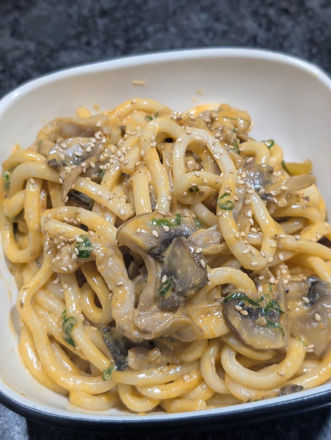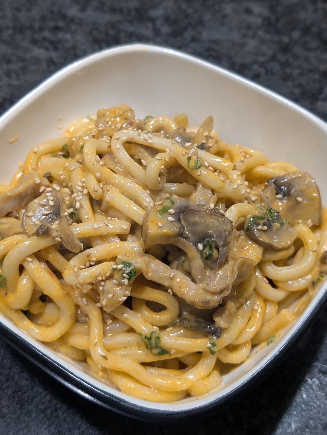 Once the mushrooms have cooked down a little, add your gochugang in and stir everything up. Next add your cream. Reduce everything just a little, then add the green onions, toasted sesame seeds, more butter, and grate in the Parmesan. Adjust seasoning if needed.