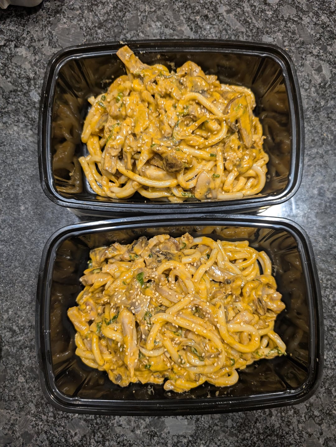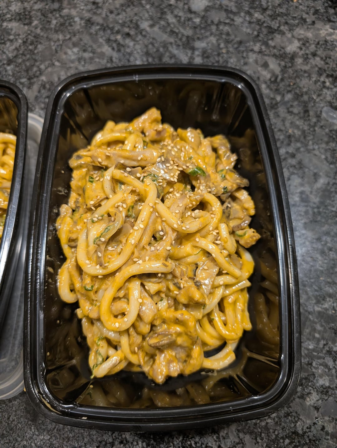 Dinner tonight and lunches for the rest of the week is spicy, creamy, pork-y, and literally so delicious I went back and ate more from the pan after finishing my bowl 😅