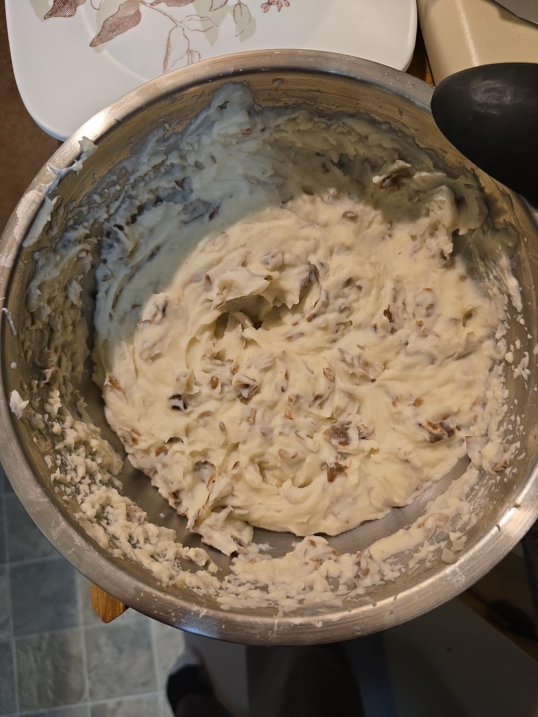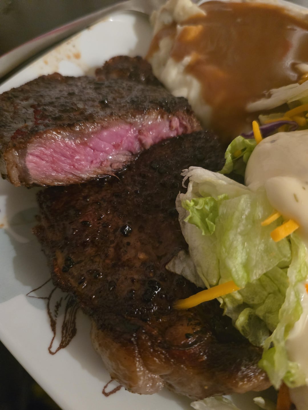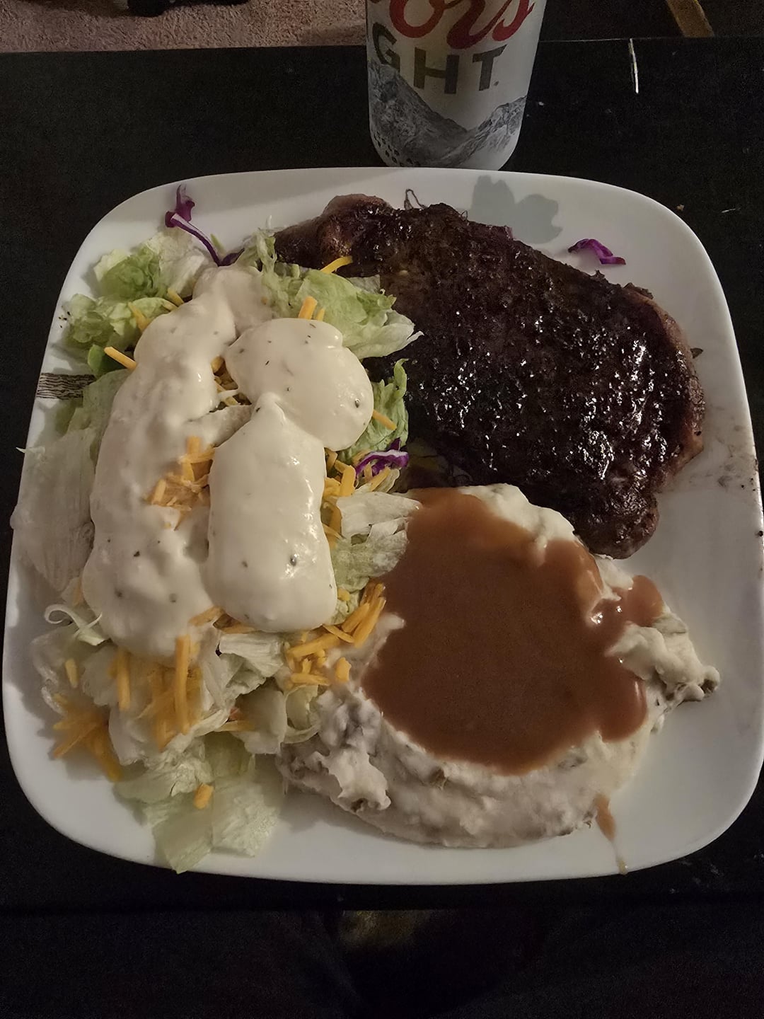 Also made garlic ranch mashed potatoes. Cubbed potatoes, boiled till fork soft, powdered garlic, butter, milk, sour cream and ranch. Salad was just cheap mix and the blue cheese came out way too fast lol.