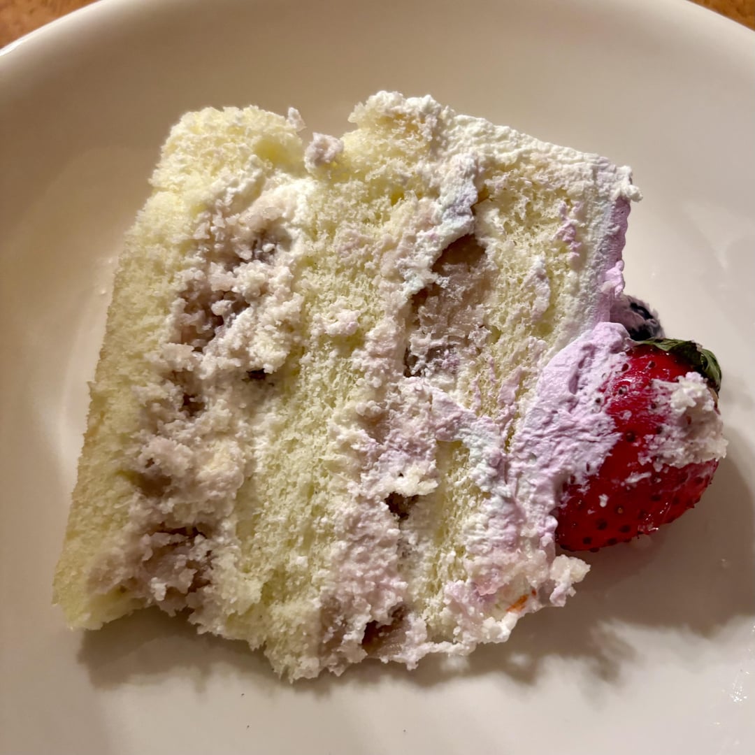 It’s a 6 inch taro cake from T&T bakery so it’s like an Asian type of cake that’s “not too sweet”. The cake itself is spongy and there’s whipped cream and taro paste (no buttercream). The fruit is just fruit, no glaze or anything added on top of it