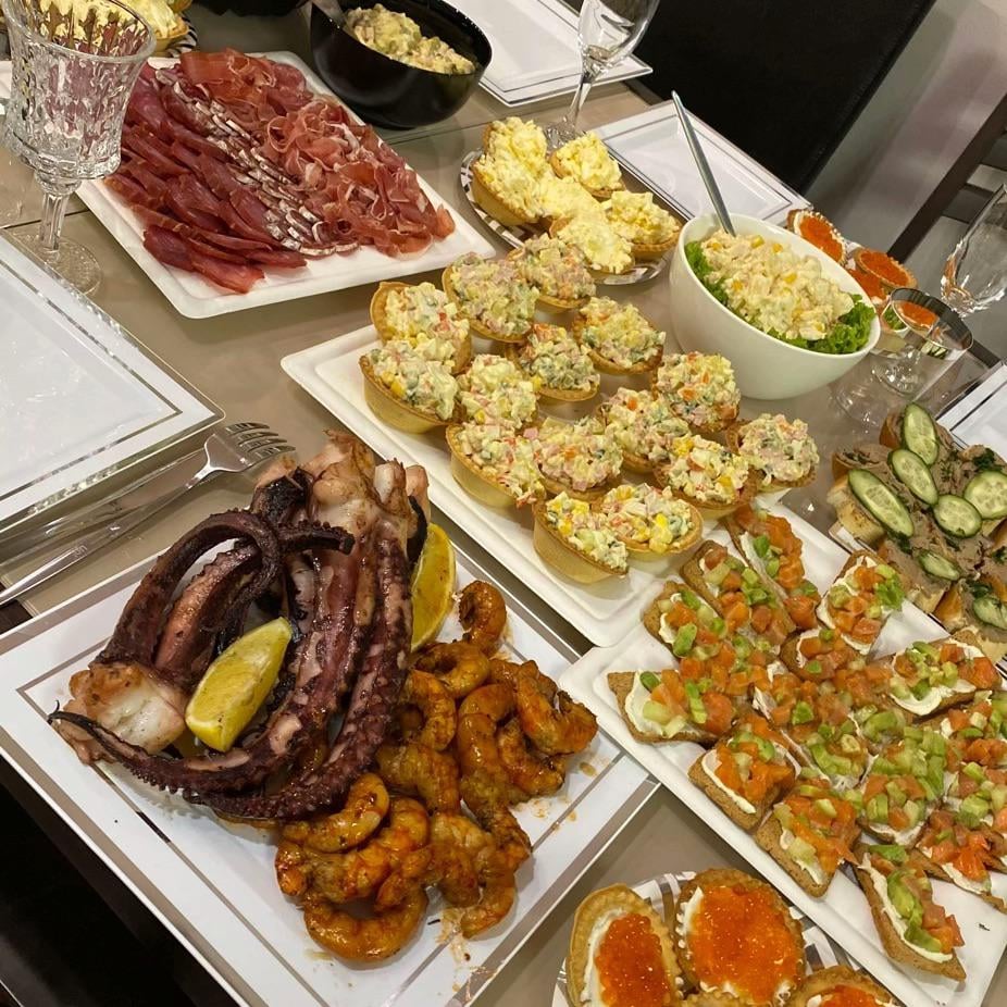 fried octopus with shrimps, sandwiches with caviar and salmon