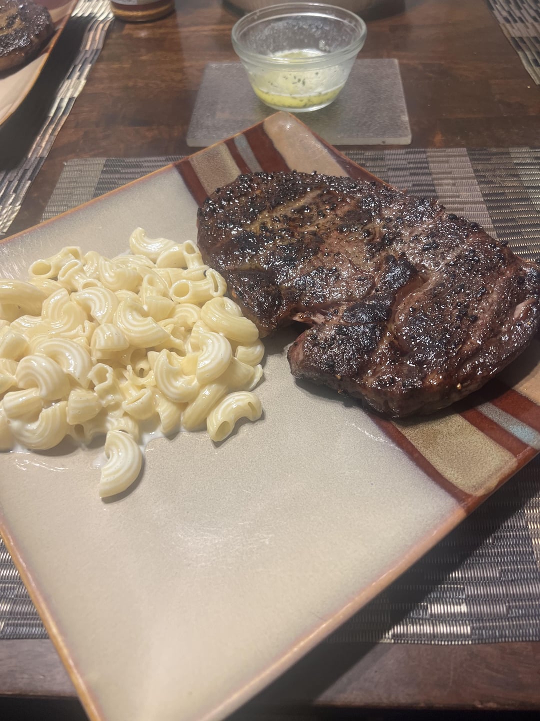 That macaroni looks fine, and the steak looks fantastic. I would be very happy to sit down to that meal.