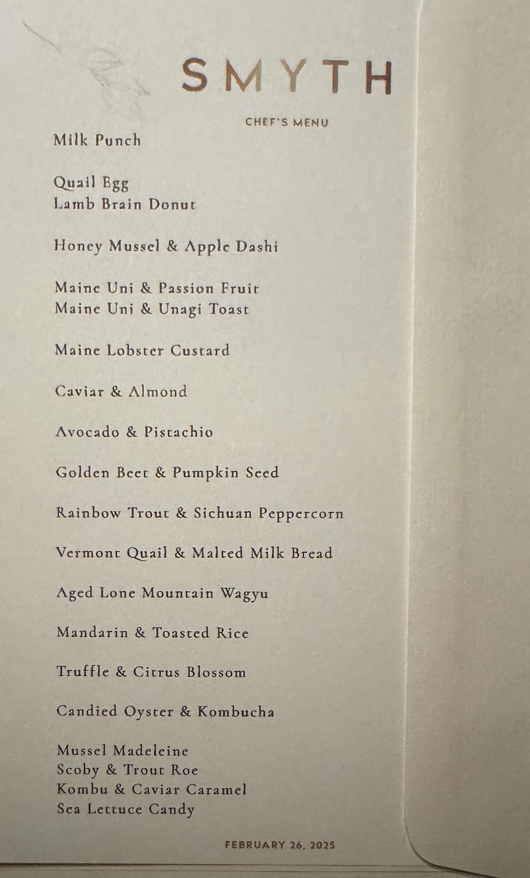 **Price** – before going in to the experience, I new it was going to be expensive. I had also read multiple posts on how the booking was unclear about whether service was included. At $550 when booked on Tock, we assumed service was included per prior discussions online. However, when we asked at the end whether service or gratuity was included, we were told no, so we added the typical 20% which puts the total for the chef’s tasting menu with tax and tip at approx. 720-750 depending on the tip. That’s on me for being uninformed and surprised. To their credit though, we did not see the typical multiple upcharges for potential addons. I hate that practice and can appreciate how Smyth did not present those options separately but rather the baseline cost of the menu was a bit higher.