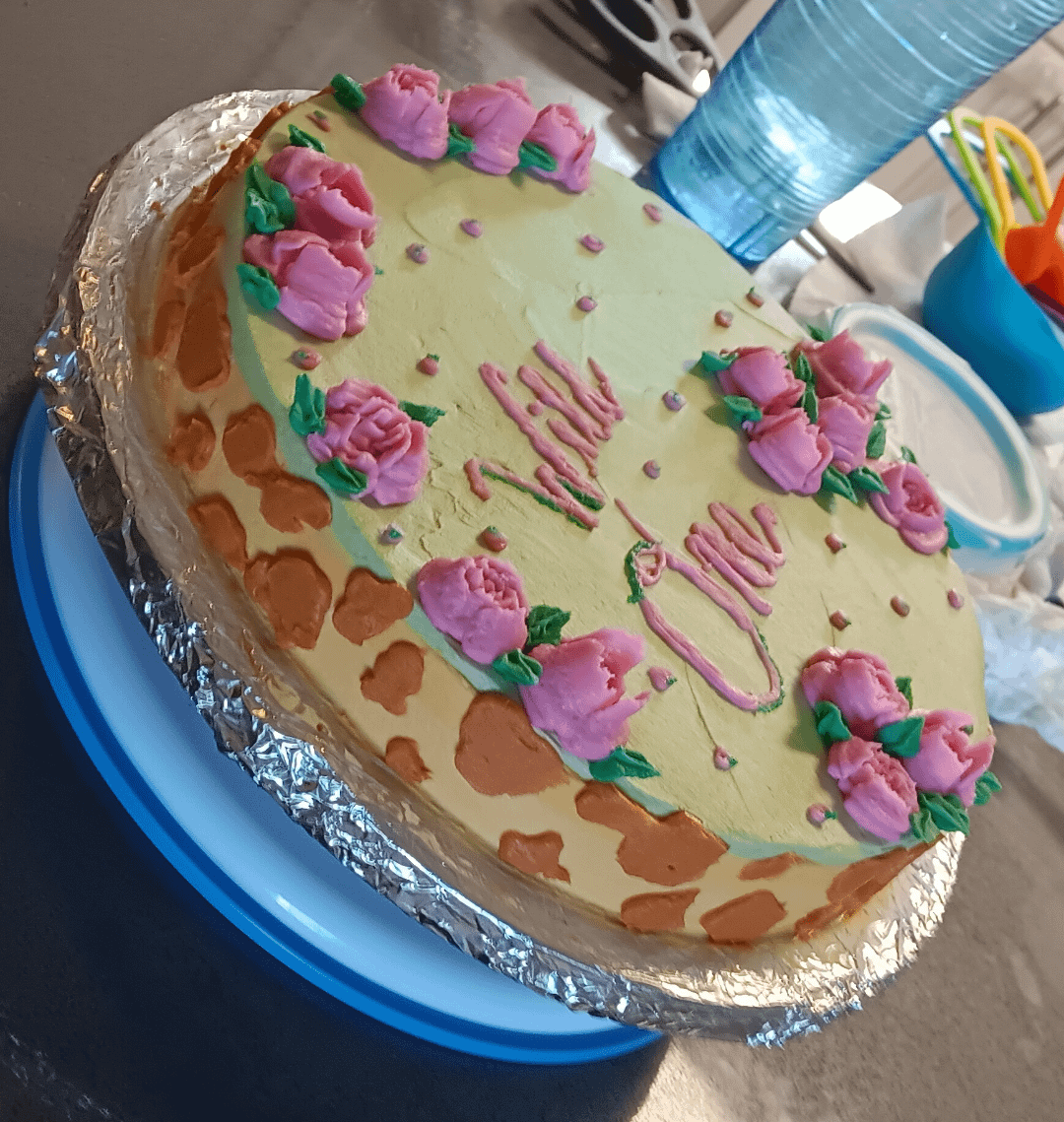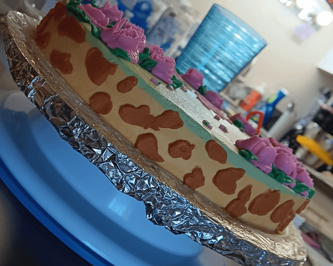 I think it came out pretty nice! I was pleasantly surprised with the overall finished result but to be honest, I am well aware I need LOTS of practice keeping my flowers uniform (also on her actual cake, I think I will make them two tone in color, just for some added flair.) The lettering I did with a tipless piping bag that I mistakenly made way too tiny causing me to quickly realize that I should've used my lettering pen thing because its way too sloppy this way.
