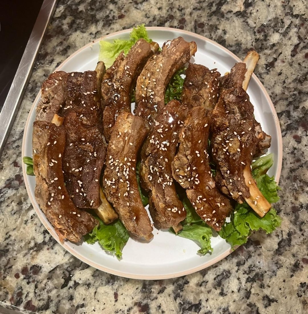 Smoked a rack of pork ribs over some post oak, cut them into individuals, tossed in corn starch and deep fried until crispy. Tossed in Japanese bbq and finished with some sesame seeds. 10/10