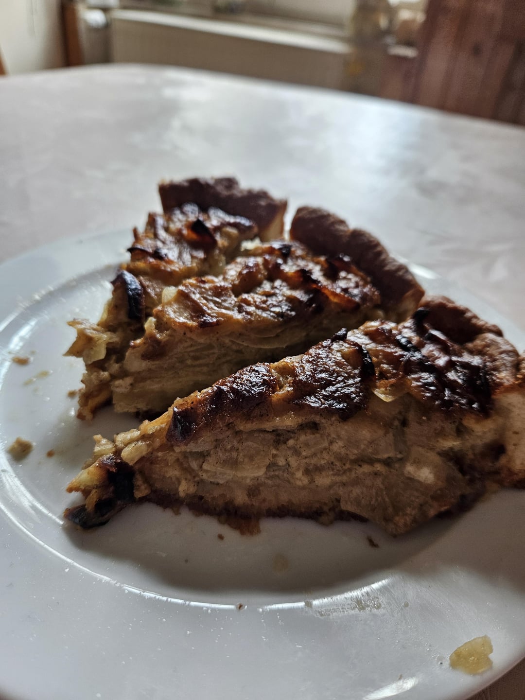 but it’s actually pretty simple basically you make a yeast or quark (sry i don’t think there is an english translation) oil dough and fill it with a mixture of onion, cream, eggs and some grated cheese you can also add cubed bacon if you like and then bake.
