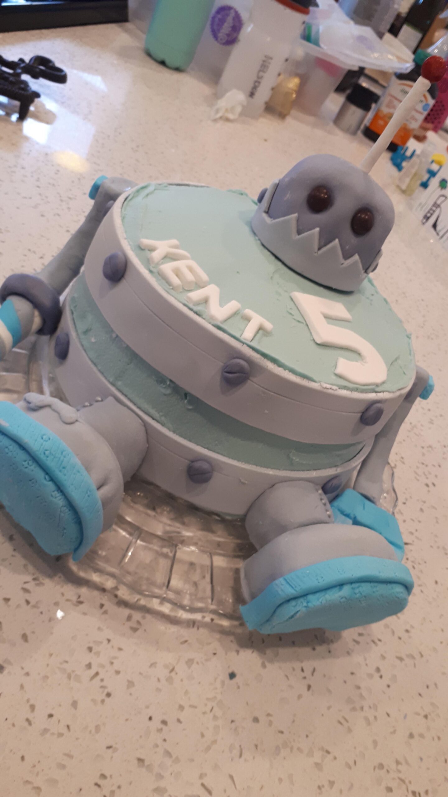 I’m glad your kid got a really nice cake. I’m no super professional with fondant because I’m still learning. Just some giving you some advice, have some water with you to smooth out some of the wrinkles and also probably not stretch out the fondant too much.