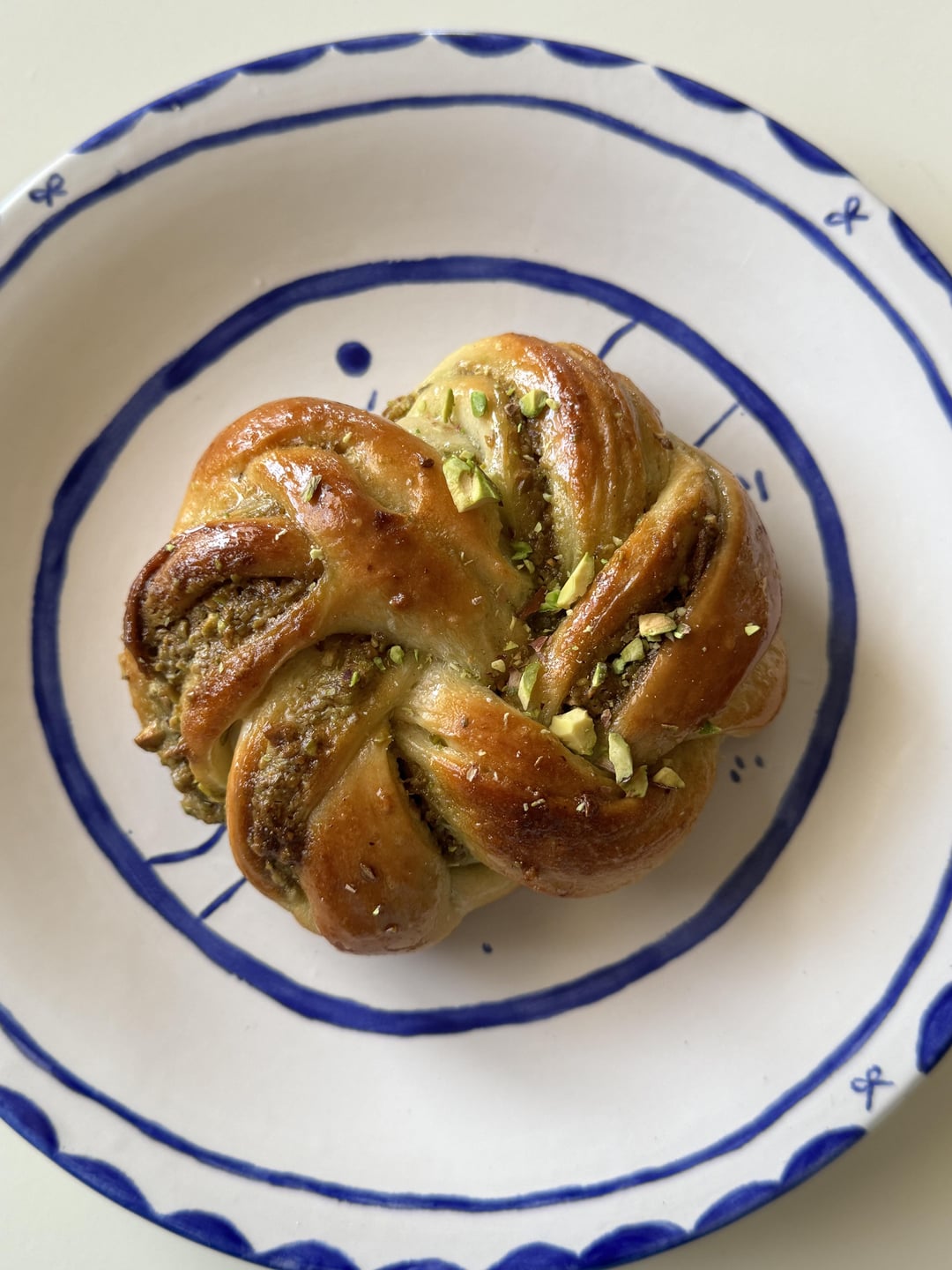 Not sure if my filling ratio is the same as his but I used the whole jar of pistachio butter! I also added a final step of brushing these with sugar syrup I made with almond extract added for some extra shine and sweetness. These were so yummy!