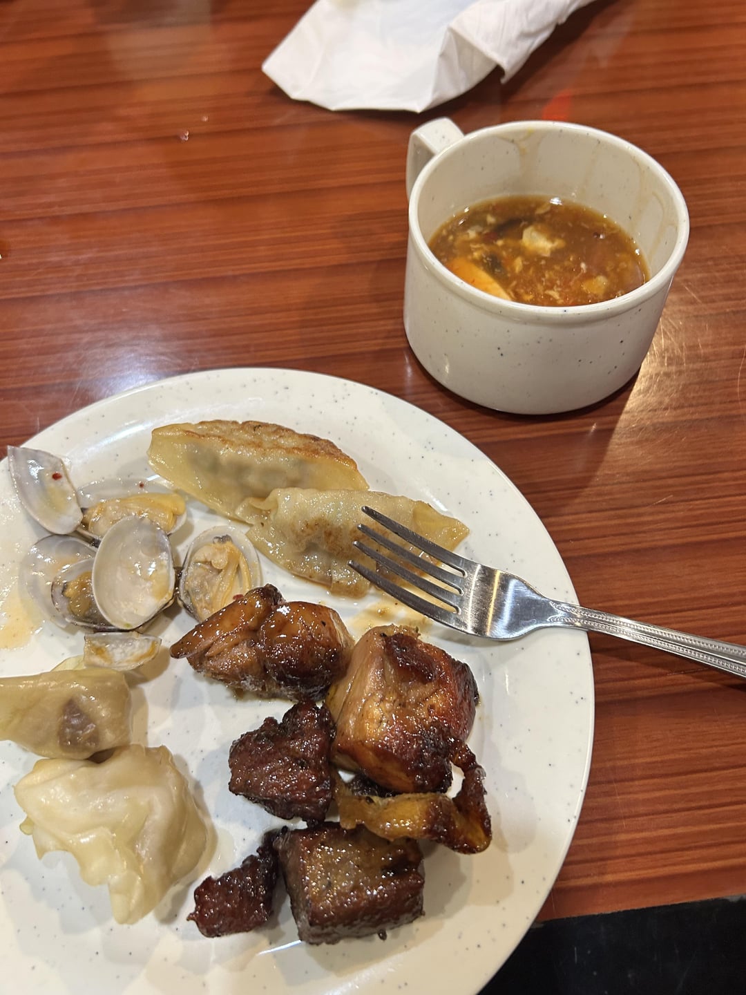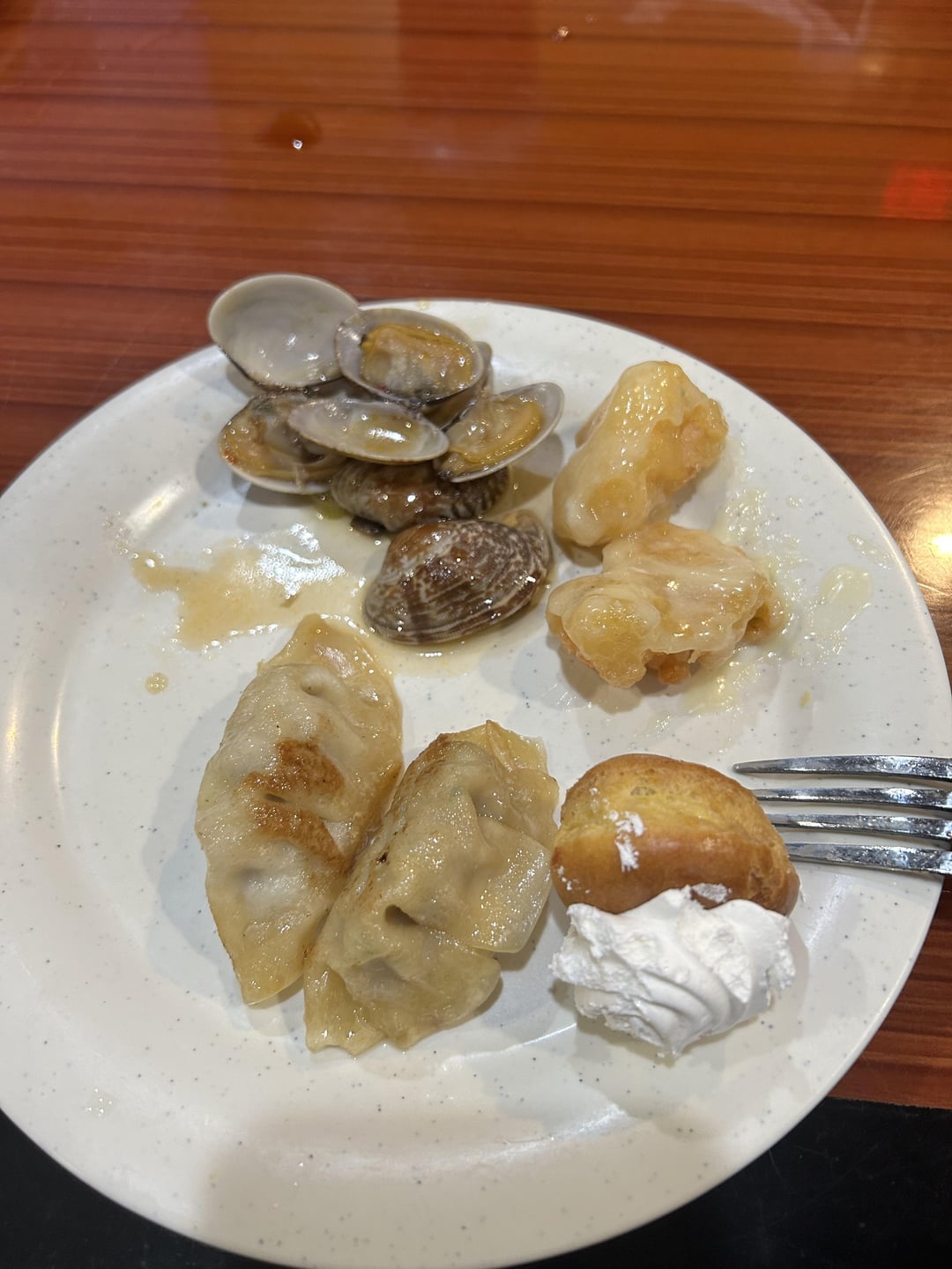 Pic 1: Assorted sushi (3 regular, 1 tempura), tempura shrimp, scallop/crab salad, steak bites, peanut chicken. Pic 2: clams, gyoza, 3 piece steak bites, 2 teriyaki chicken, and 2 dumplings(?). Pic 3: gyoza, clams, 2 coconut shrimp, the little dessert wasn’t filled with anything just flakey.