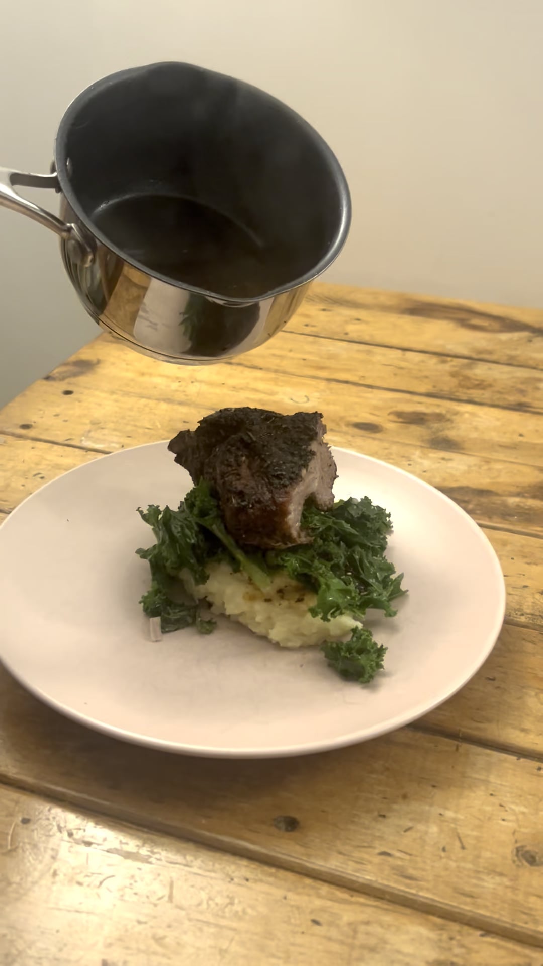 South African spiced lamb ribs, garlic shallot and tyme mash, lemon zest shallot sage and thyme kale with a mint jelly and Rioja wine gravy