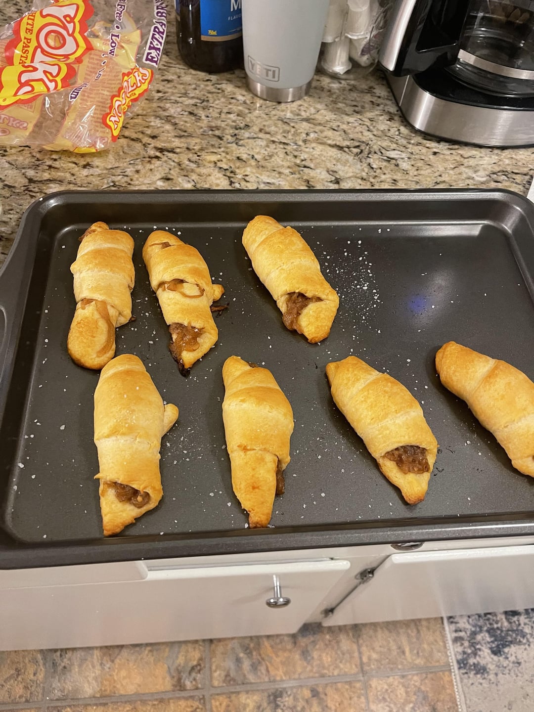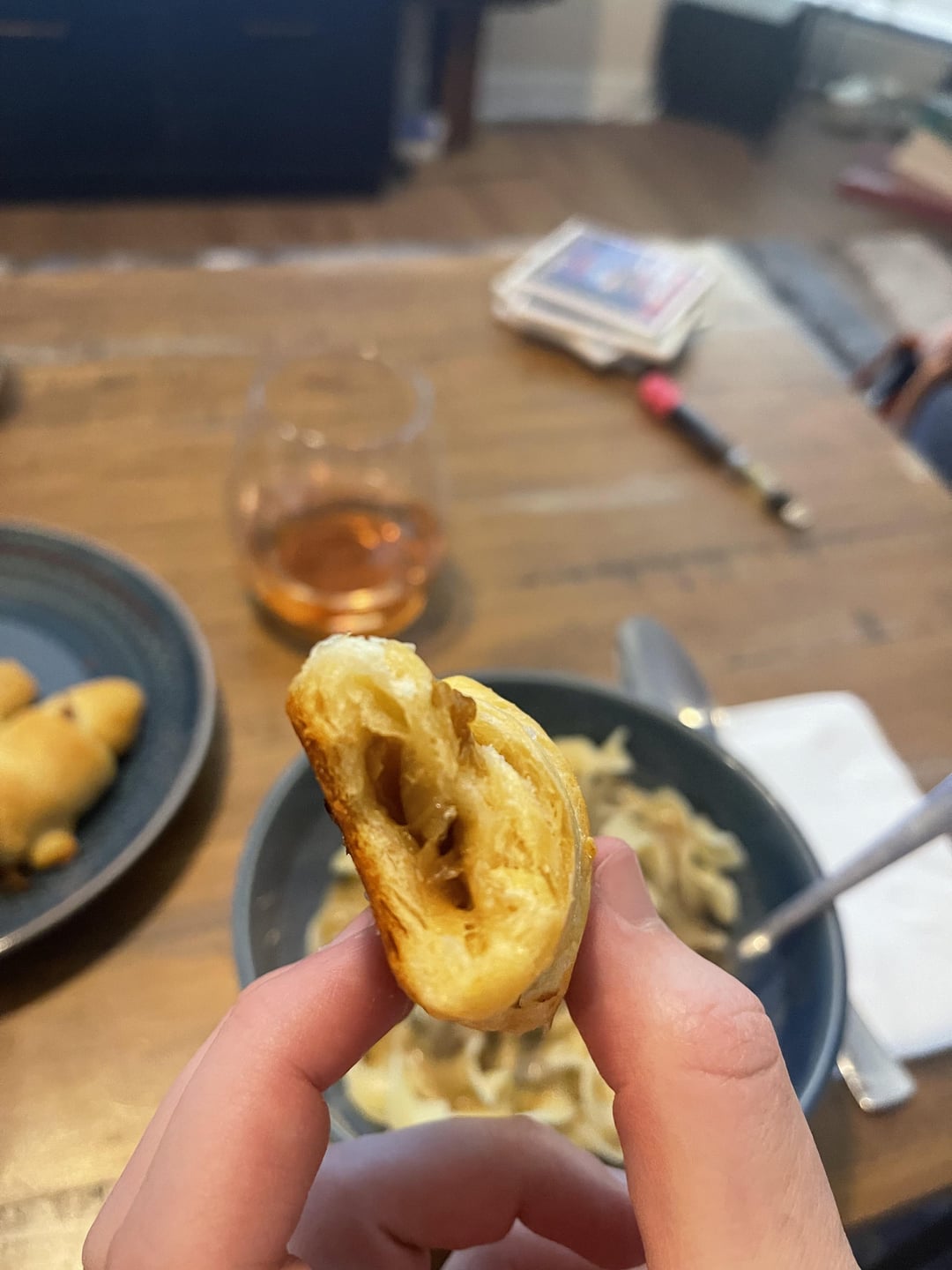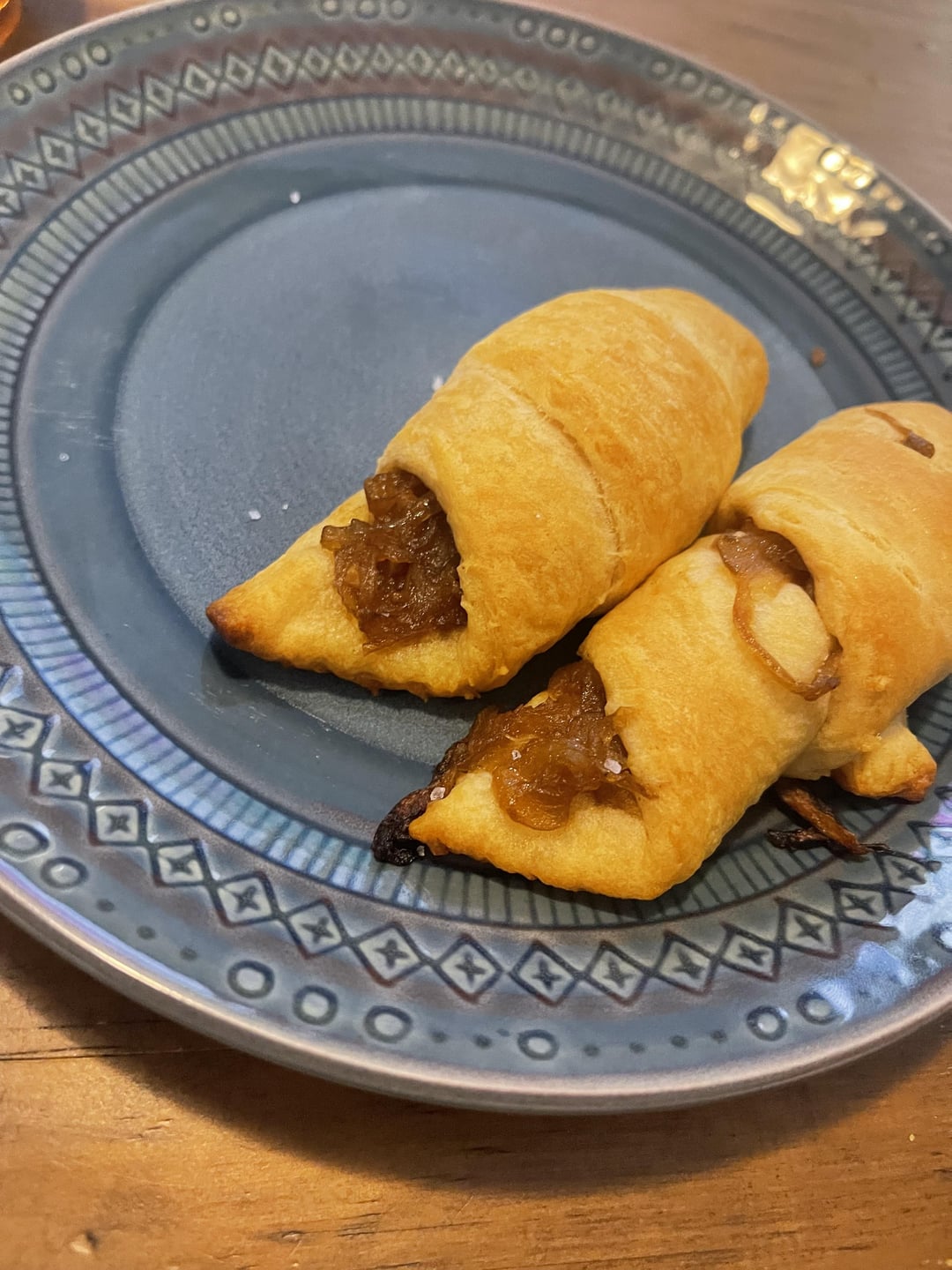 2. 3 medium sized white or yellow onions. HIGH HEAT. 2-3 tbsp olive oil. 1 tbsp of salt, 0.5 tbsp pepper, a spoonful of minced garlic towards the end. 1 cup of beef broth cut with 0.5 cups of water to periodically deglaze throughout the cooking process to keep the onions happy. Stir pretty much the whole time every 1-2 mins, flatten out and let the moisture evaporate until the onions start sticking a little bit on the pan then deglaze. Once they reach the 35-40 min mark and look done, spoon a small amount onto the large end of the crescent rolls. Roll up tight, sprinkle with some sea salt and bake for 11-13 mins. Try not to eat them all at once (difficult). It makes way more than you need for the crescent rolls so you’ll have plenty of extra to save for other things.