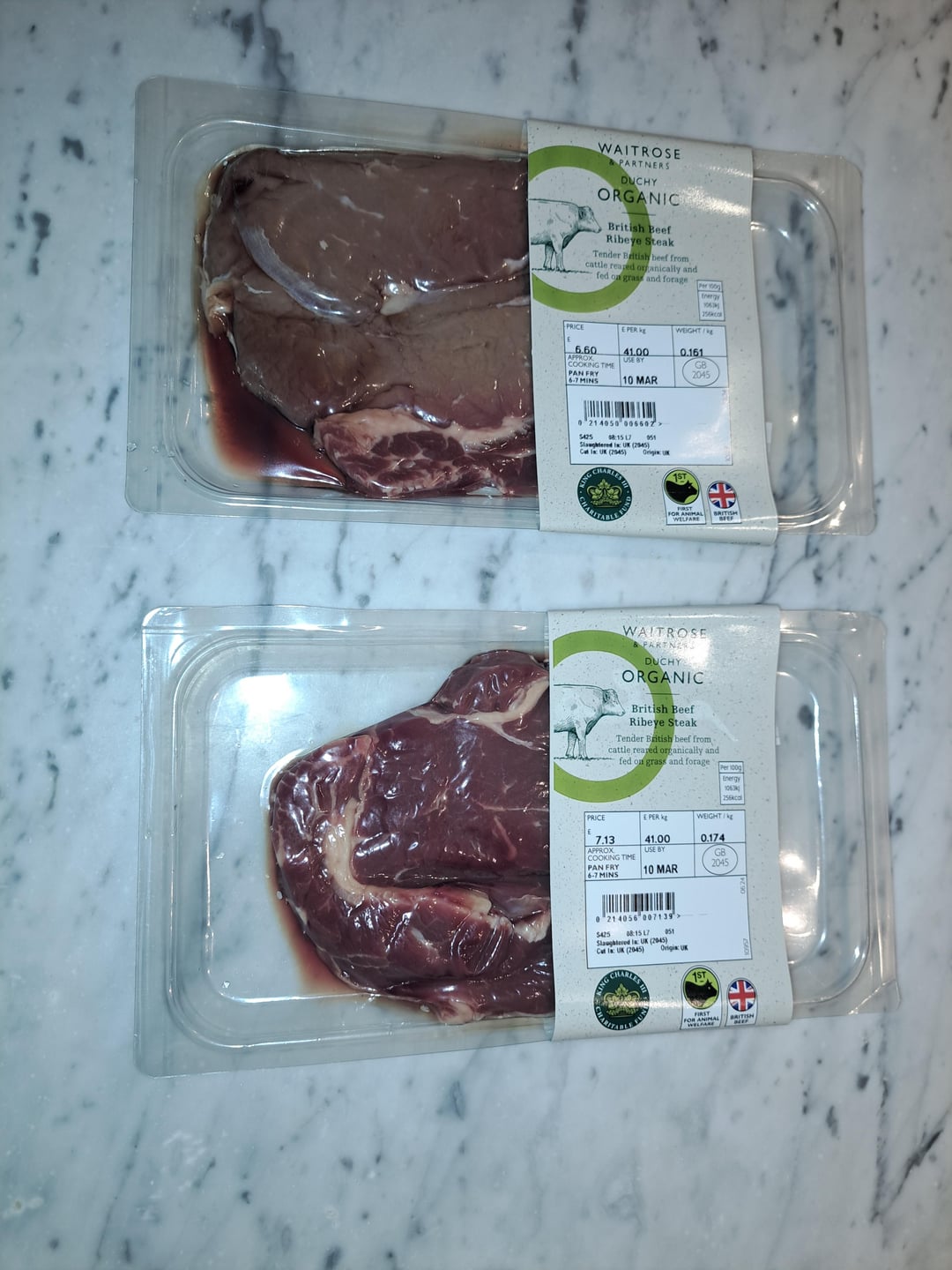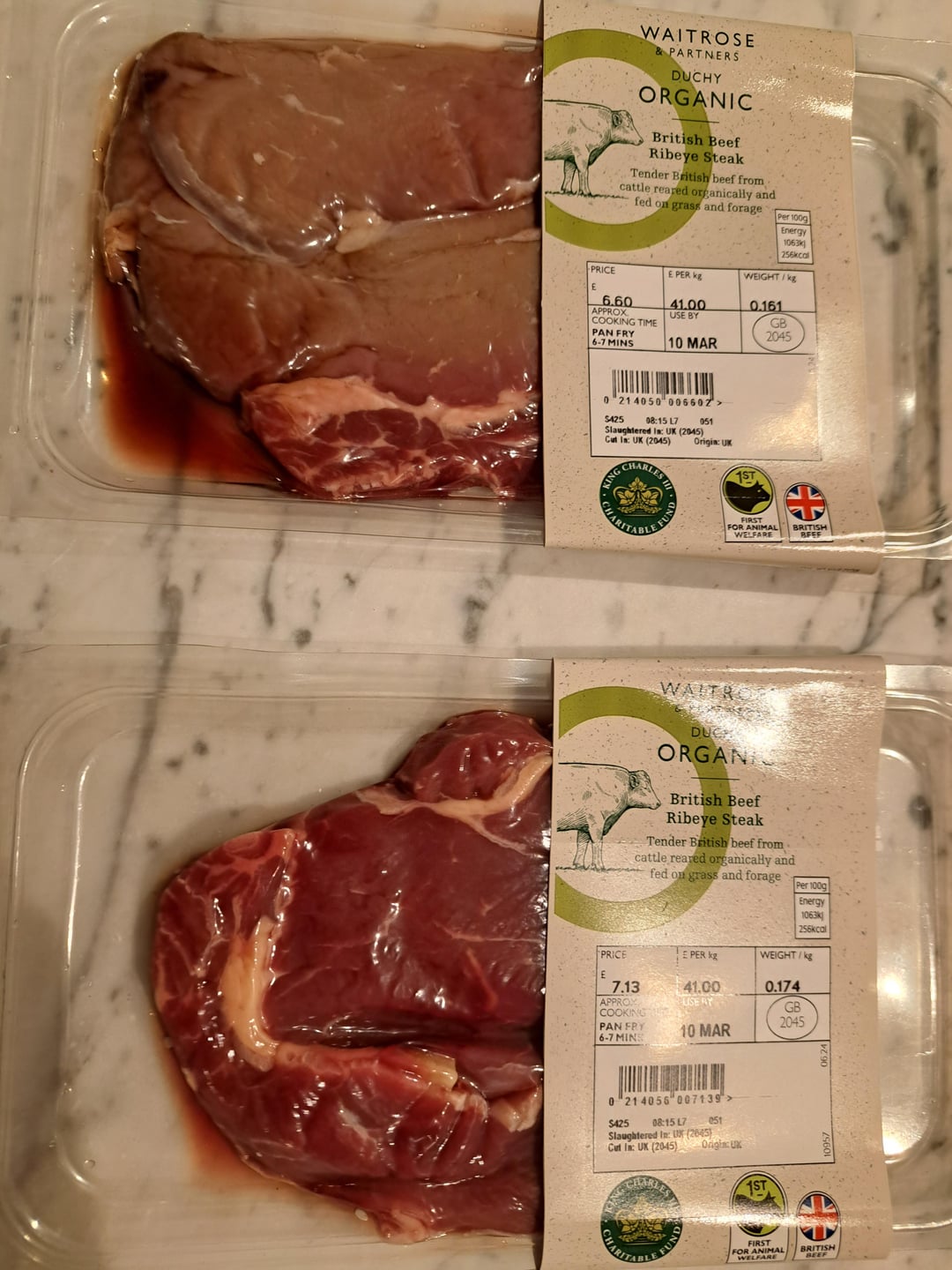 Hello, I am not sure how visible it is on the photos, but these 2 ribeye steaks have some differences in their coloring – one of them is much more reddish that the other one and it looks better to me. Do you think the other one is good to it and why is this difference as they have the same code, use by date?, etc