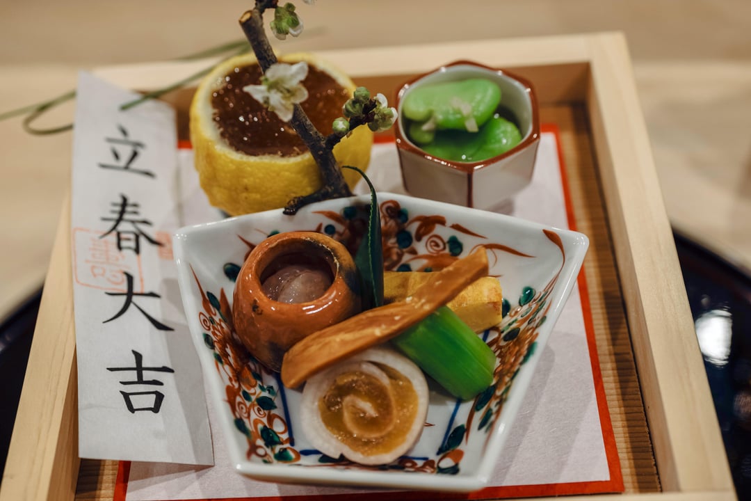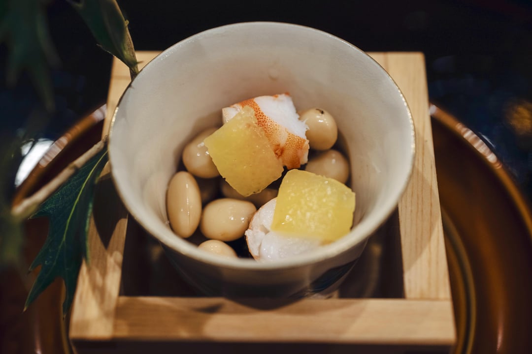 6. Hassun: soramame, dried squid, ebi, tamagoyaki, shirako jelly in lemon