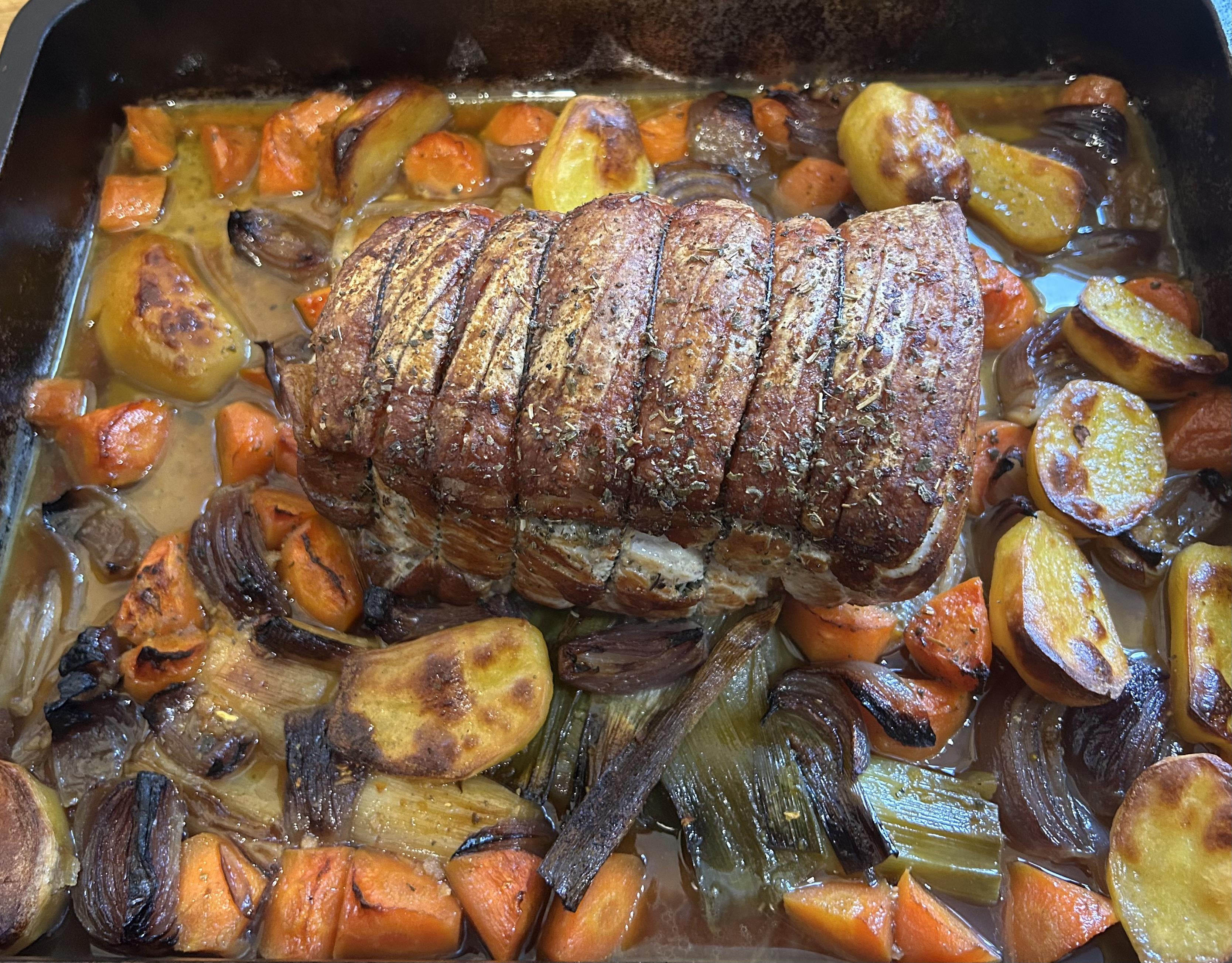 Pork was pan fried to render then roasted for 1 hour 45 mins then added chicken stock to the roasting tin, keeping the skin bone dry.