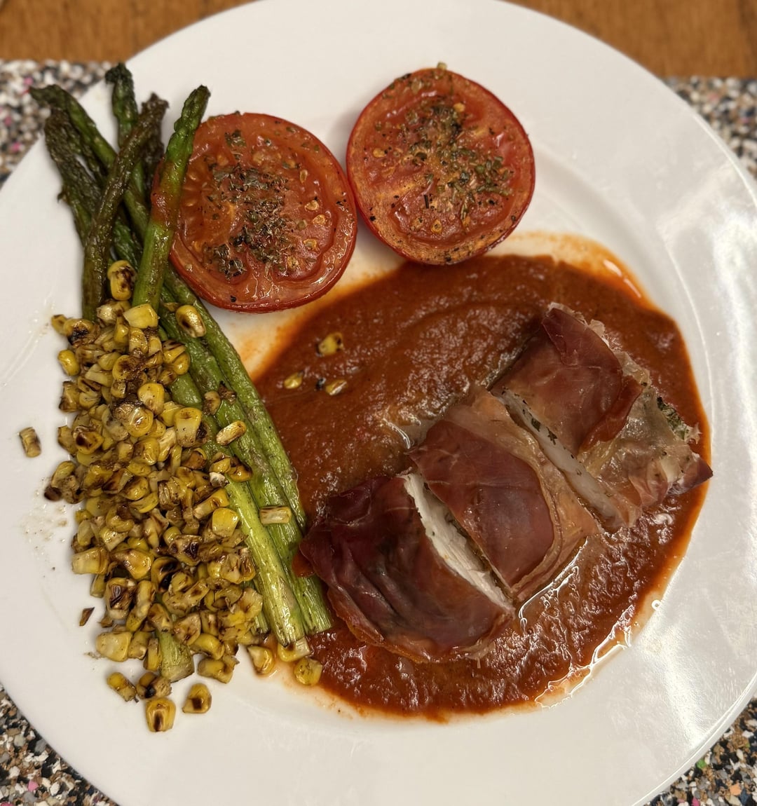 Monkfish – oil, thyme, salt, pepper, Parma ham