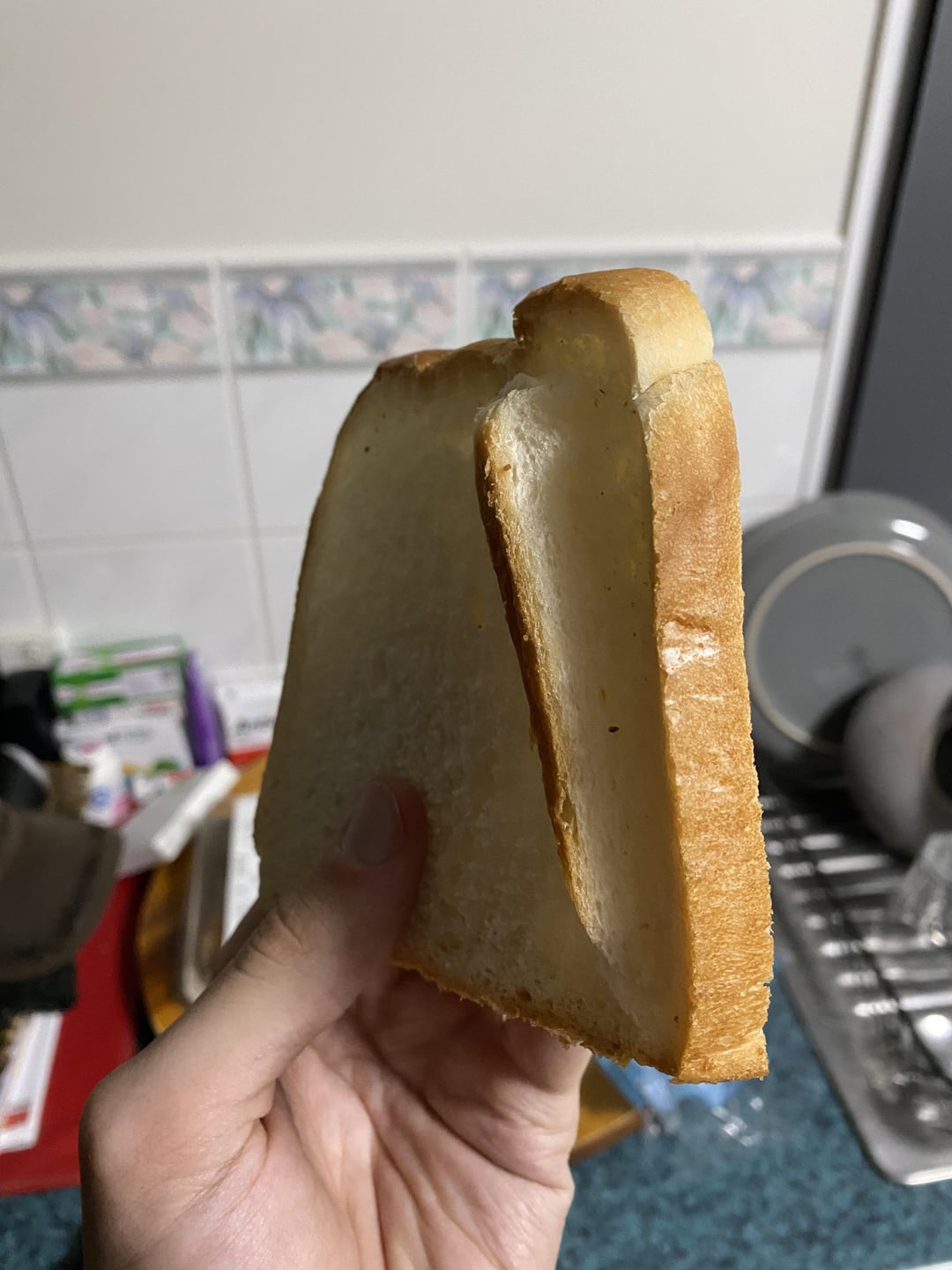 It almost looks like a neighboring piece of bread that got extremely squished rather than sliced off