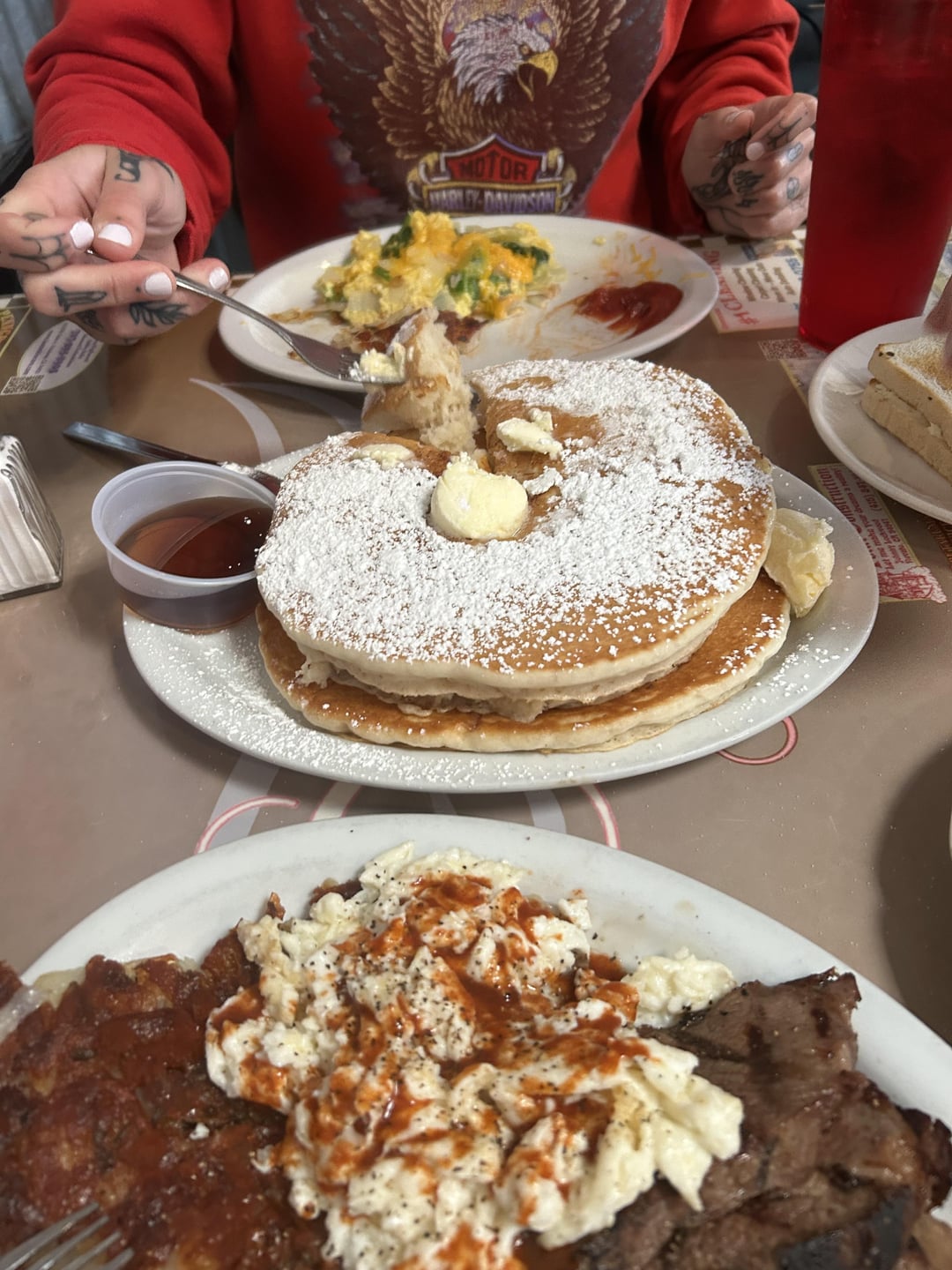 Estimated 10oz of tri tip. Subbed egg whites guessed 6 eggs worth. Hashbrowns. Second photo buttermilk biscuit, used about a tbs of jam on it. Pancakes I have about one (was a three stack) and used maybe 1/4-1/3cup of syrup. I estimated about 1450. Bonus point for macros