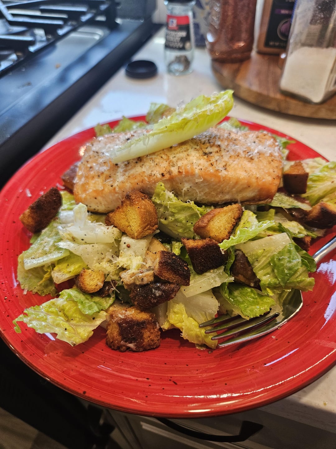 Ceaser salad with salmon, croutons, and mushrooms!! 🙂 it was delicious by DragonsMyWayRule Write A CommentYou must be logged in to post a comment.