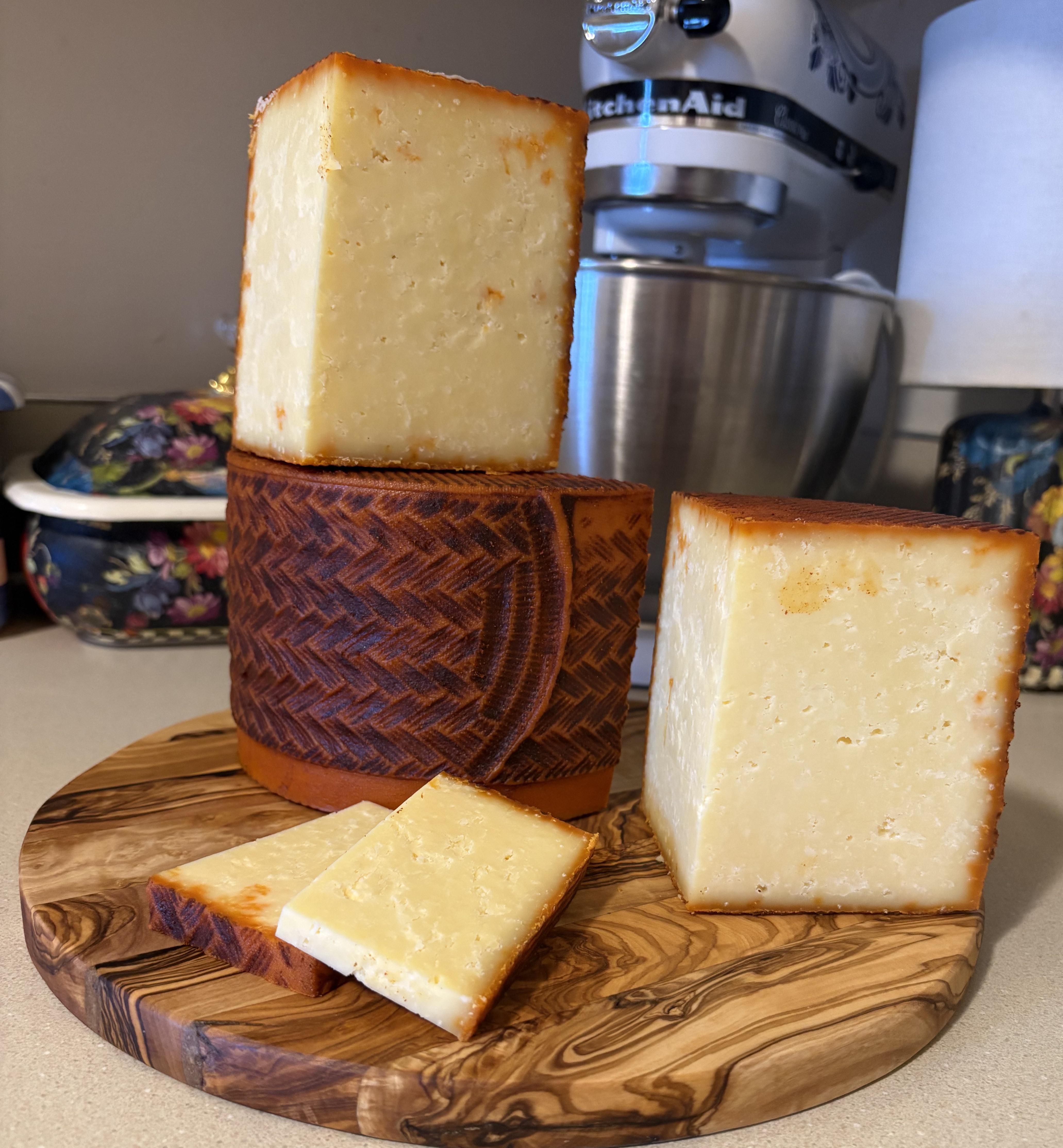I made Hispanico cheese with a smoked paprika and olive oil rind. Aged three months.