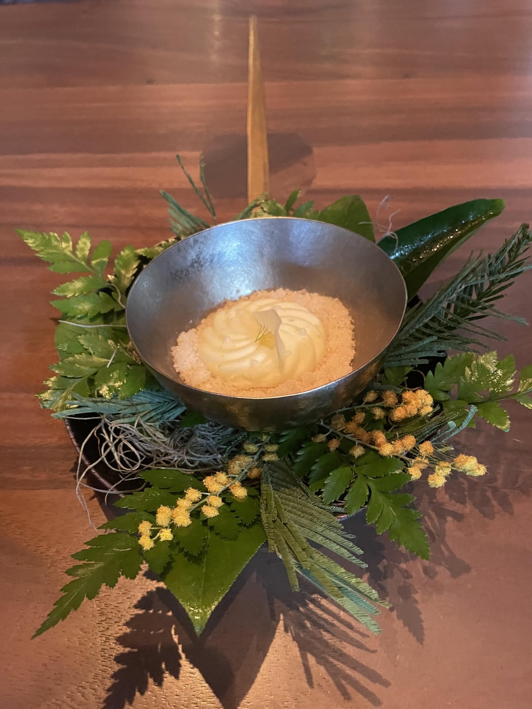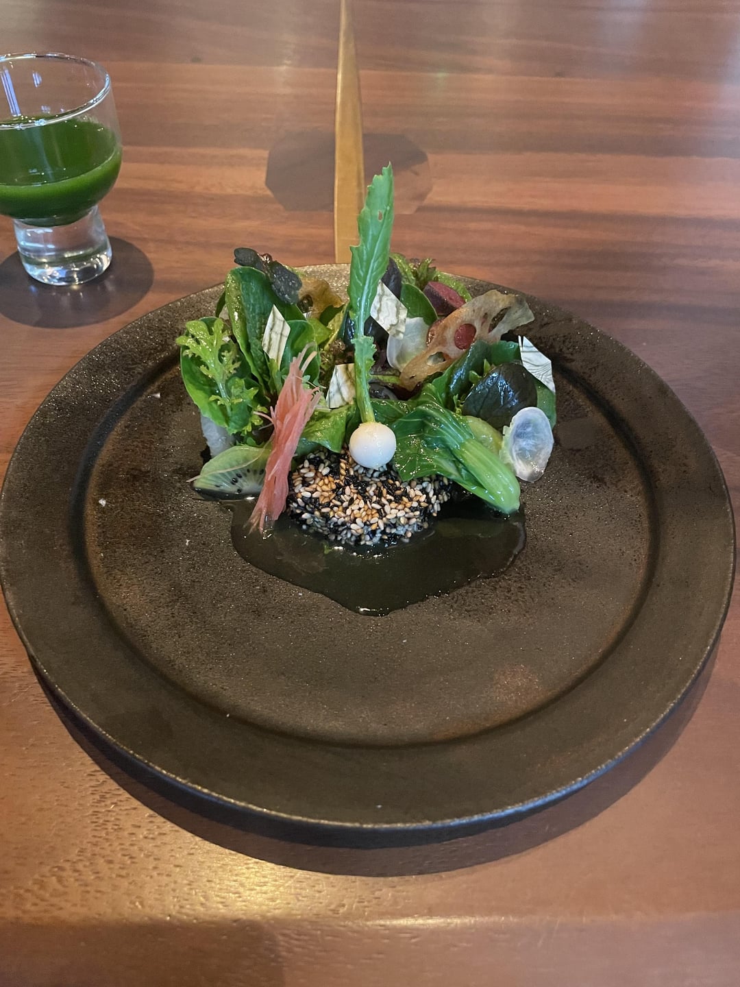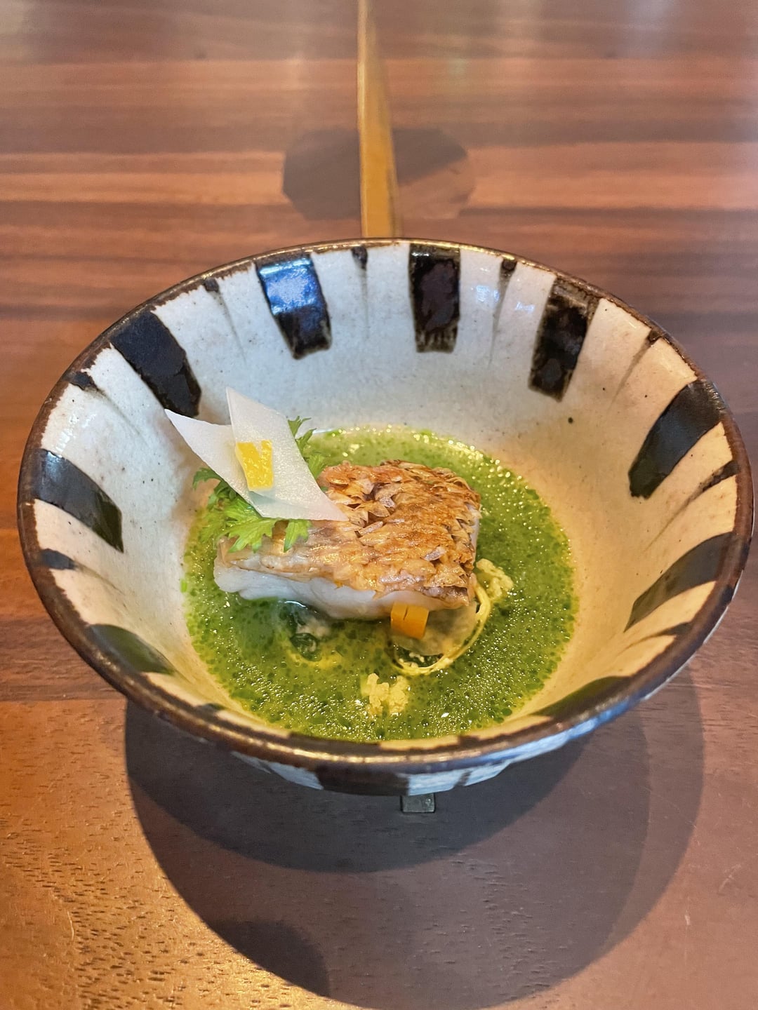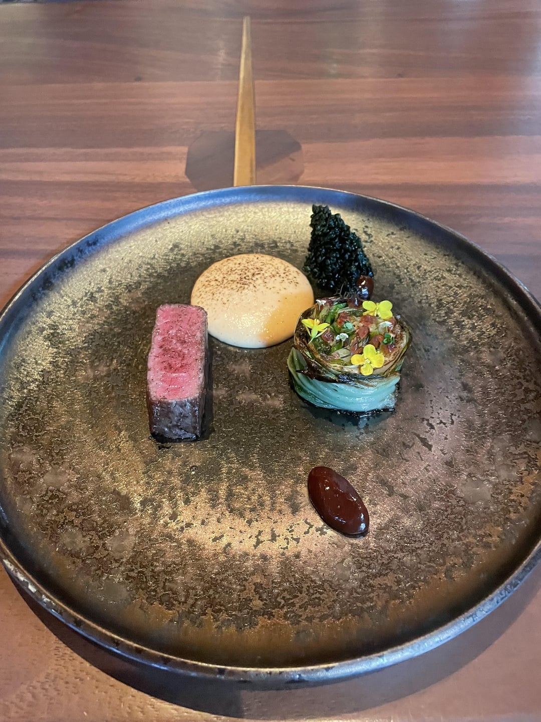 * Meals always start with an assortment of fish and shellfish, a panna cotta with shaved black truffle and five-spiced duck liver * Potato purée with osetra caviar and tempura fried ? in ponzu sauce * Salad with goma dofu and kiwi * Crispy amadai in cauliflower dashi with preserved lemon, yubu and Wasabina. This was the standout among standouts for me. Just a delicious combination of tastes and textures. * Intermezzo: Buddha’s hand, olive oil, black tea and Douglas Fir * Wagyu with cabbage, crispy kale, garlic-miso sabayon and prune preserves * Koshikari, short rib, smoked American chestnut, broccoli and pickled vegetable * Dessert: sunchoke semifreddo encased in chocolate finished tableside with more chocolate sauce and served with vanilla bean ice cream and mochi * Petite fours
